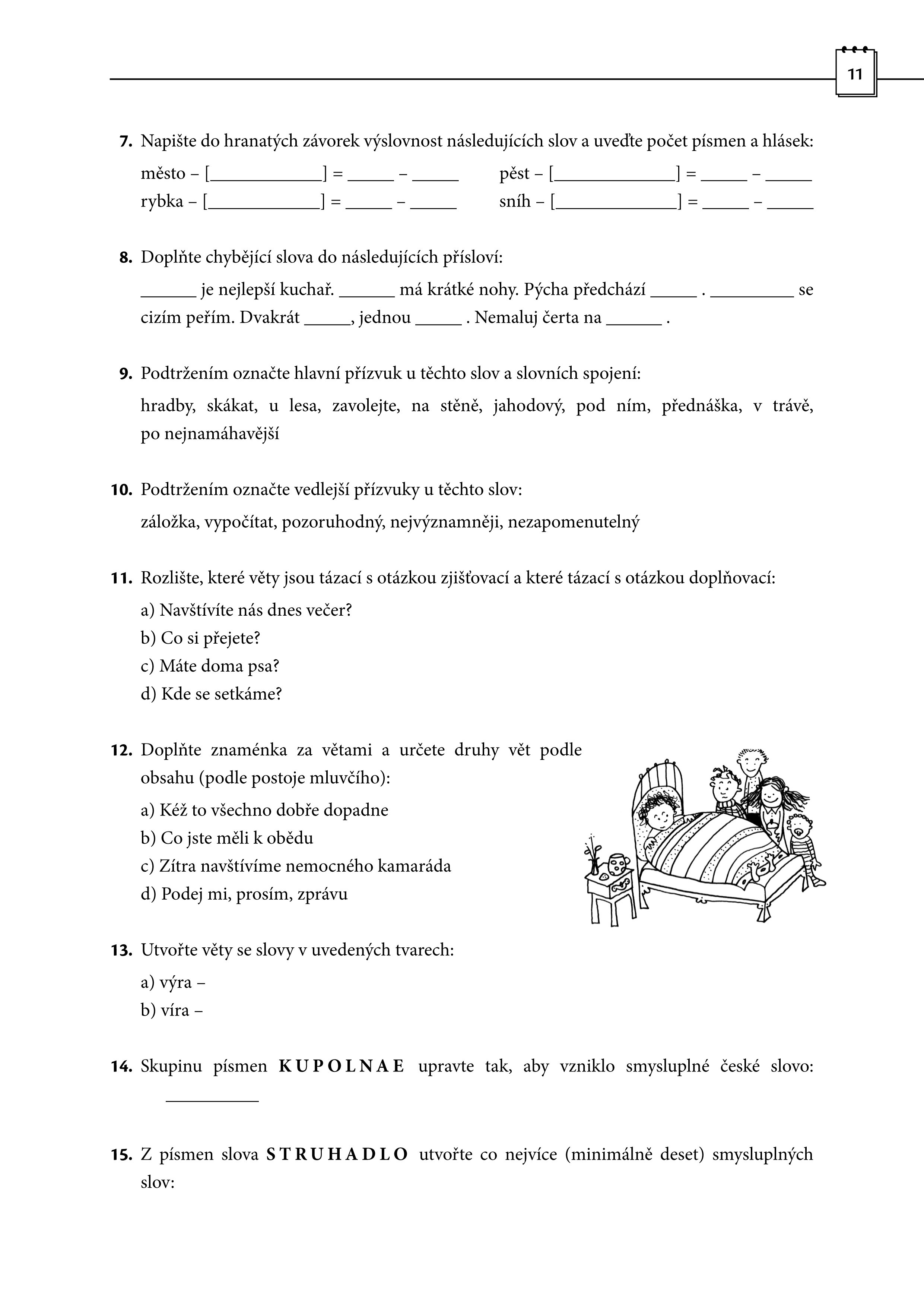 2) 15 jazykových testů: prvních devět je řazeno podle tematických celků probíraných v ročníku, zbývajících šest slouží k souhrnnému opakování základního učiva. Některé z testů obsahují ještě i pravopisnou část a navíc praktické „taháky“ zahrnující pravopisné jevy, v nichž se často chybuje.
