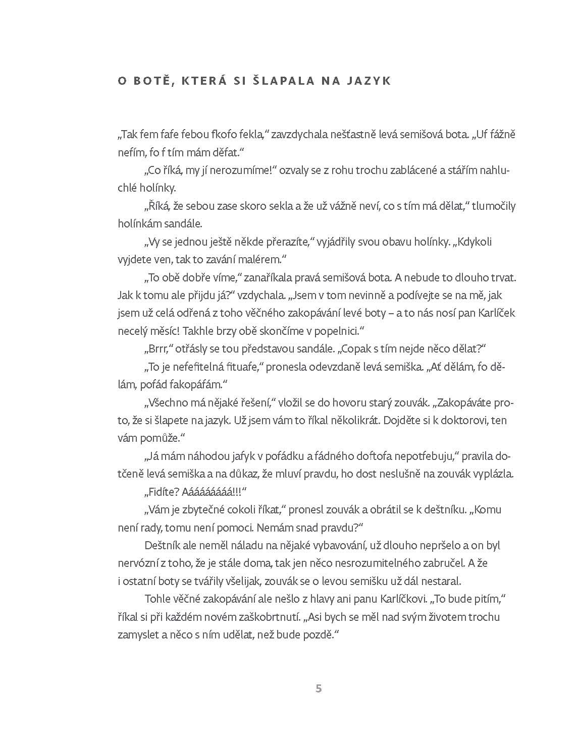 Děti se seznámí s botou, která si stěžovala, že neustále zakopává a šlape si na jazyk. A víte, jak se šišlání nakonec odnaučí? Děti se dozví nejen to, ale také si přečtou příběhy o pavouku, který chtěl být nejlepší na světě, o starém komíně a o hluchém dědečkovi a jeho hrnečku a spoustu dalších vtipných příhod a básniček.
