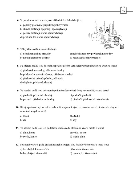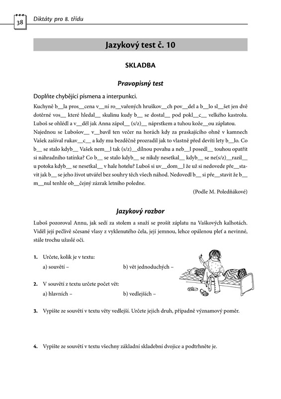 2) 15 jazykových testů: prvních deset vychází z učiva ročníku a je rozděleno podle jednotlivých tematických okruhů, např. tvarosloví, obohacování slovní zásoby a skladba. Zbývajících pět testů je věnováno souhrnnému opakování již probraného učiva. I v této části najdete doplňovací diktáty a praktické „taháky“ s obtížnými pravopisnými jevy.