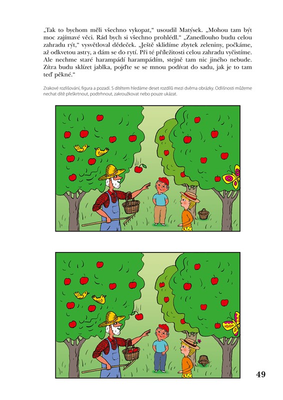 Děti, které nastupují do 1. ročníku základní školy, budou potřebovat zrakové vnímání vedle sluchového vnímání, rozvinuté grafomotoriky, pozornosti a dalších předpokladů tvořících školní zralost, k tomu, aby se úspěšně učily číst, psát, počítat, aby měly ze školy radost. Právě zrakové vnímání, jemuž je tato kniha věnována a které rozvíjí, je důležité pro rozlišení písmen, číslic, dodržování jejich správného pořadí. Jistě uznáte, že pokud získá dítě příjemnou, hravou formou dovednosti, které bude ve škole potřebovat, bude se lépe učit a bude ve škole rádo. Nesmíme však také zapomenout na jednu důležitou věc: plnění úkolů, povzbuzení úspěchem kladně ovlivňuje pozornost dítěte, rozvíjí jeho pracovní návyky. V knize uvedená cvičení, úkoly, sám zajímavý příběh také působí na rozvoj slovní zásoby, schopnosti souvislého vyjadřování. Nejde tedy jen o „pouhé“ rozlišení tvarů, vnímání figury a pozadí, rozlišení detailů a rozdílů, jde o vytváření spojení v mozku, rozvíjení rozumových schopností dítěte.