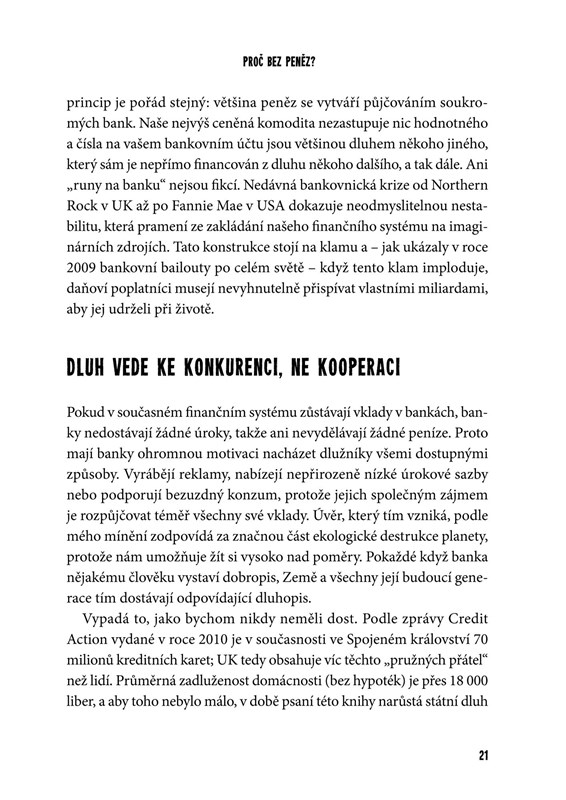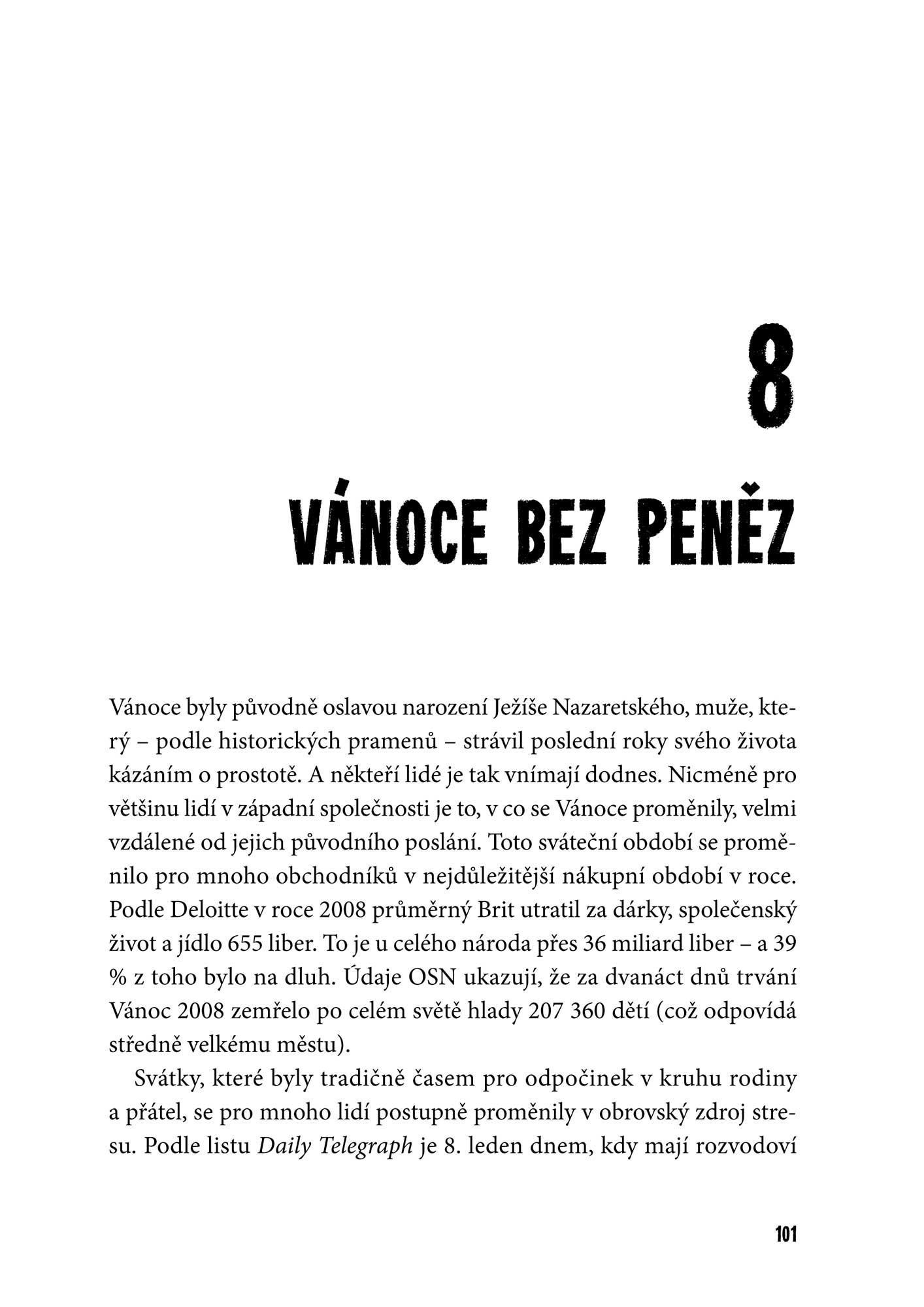 Nacházíme se v kritickém bodě dějin. Nemůžeme mít donekonečna rychlá auta, počítače o velikosti kreditek a všechny moderní vymoženosti, a zároveň čistý vzduch, rozlehlé deštné pralesy, čerstvou pitnou vodu a stabilní klima. Naše generace může mít jedno, nebo druhé, ale ne obojí. Lidstvo si musí vybrat. Obě možnosti mají své „náklady obětované příležitosti“. Přístroje, nebo příroda? Vyberte si špatně, a příští generace už nemusí mít ani jedno. To jsou slova Marka Boylea, autora této jedinečné knihy, který vás provede svým odvážným experimentem, při němž se zcela zřekl peněz.