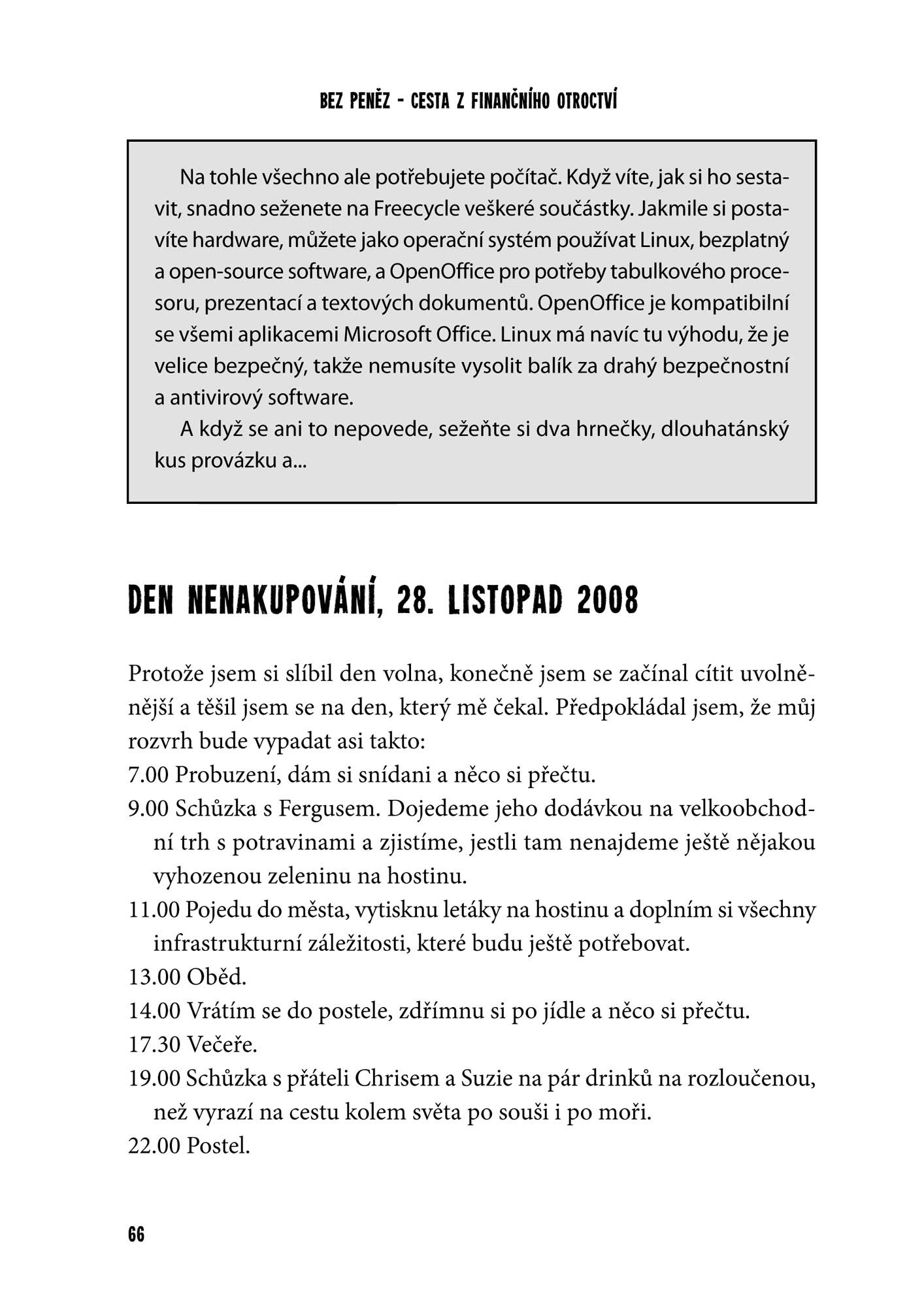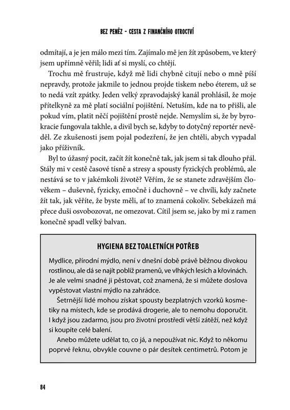 Čtivou a poutavou formou se seznámíte s jeho motivací i životní filozofií a stanete se jeho souputníky na cestě, kterou nelemují bankovky a platební karty. Co je však nejvíce fascinující – Markův příběh přímo vybízí k zamyšlení nad zásadními otázkami životního stylu v konzumní společnosti a směřování současné západní civilizace.
