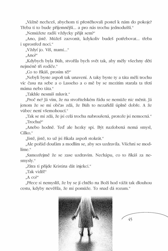 Cecílie je nemocná. Tak nemocná, že nemůže jít ven lyžovat a sáňkovat jako jiné děti, dokonce ani vstát z postele. Jednou, když je jí smutno, si namaluje anděla prstem na okno. Namalovala anděla slzou, nebo slzavého anděla? Cecílie neví. Cecílie je zvláštní holčička a o všem přemýšlí. Má na to čas, jak říká maminka, když se musí „zabavit“ v posteli. Anděl, který se u Cecílie objeví, bdí u její postýlky a drží stráž. Není ale vůbec „slzavý“. Je to veselý a moudrý průvodce, s nímž se Cecilka prochází