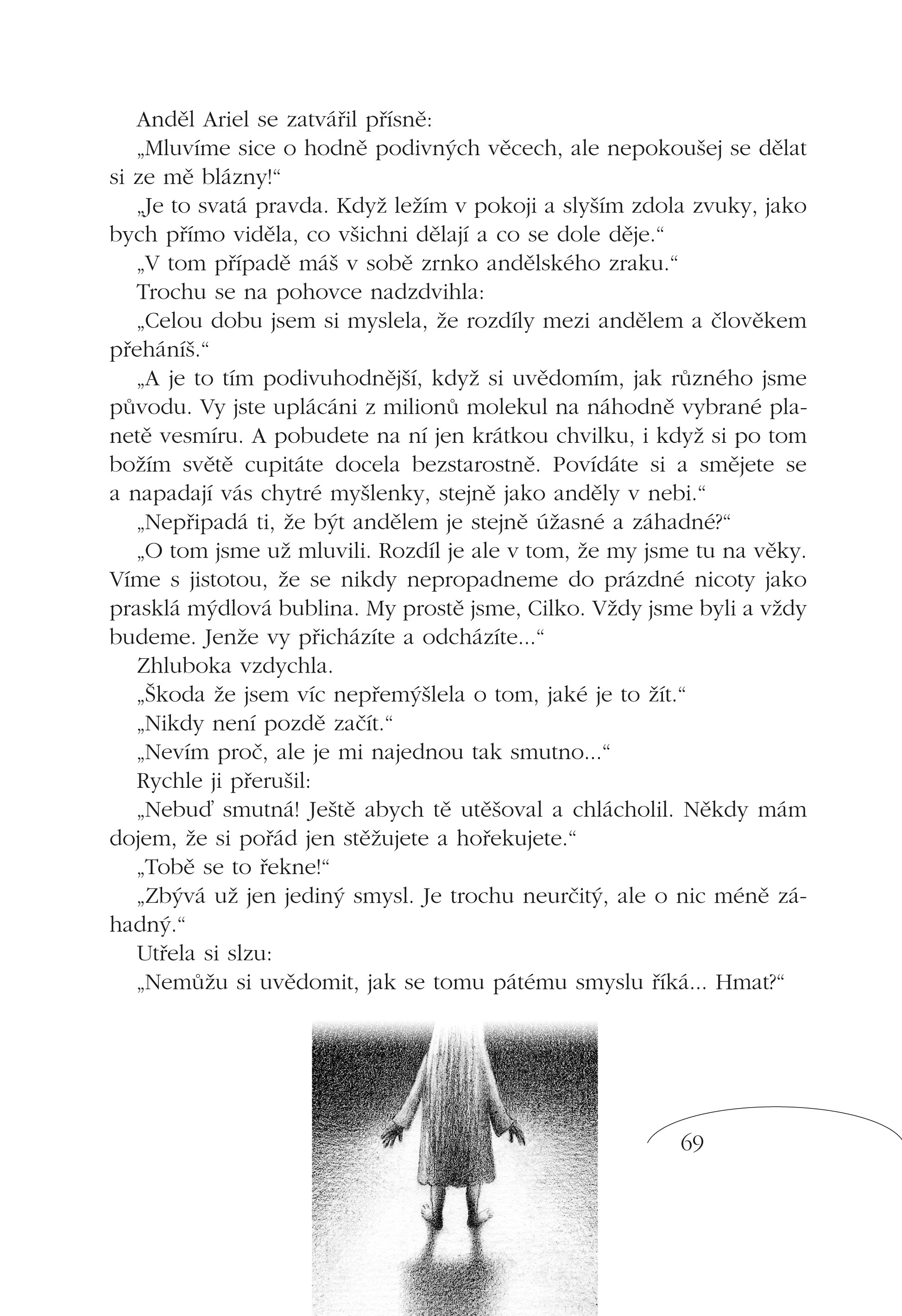 noční zasněženou krajinou, rozmlouvá a anděl jí pomáhá dobrat se až ke dnu tajemství, která ji trápí: Kdo jsem? Bude svět, až tu nebudu? Co zbyde ze mě, až tu nebudu?