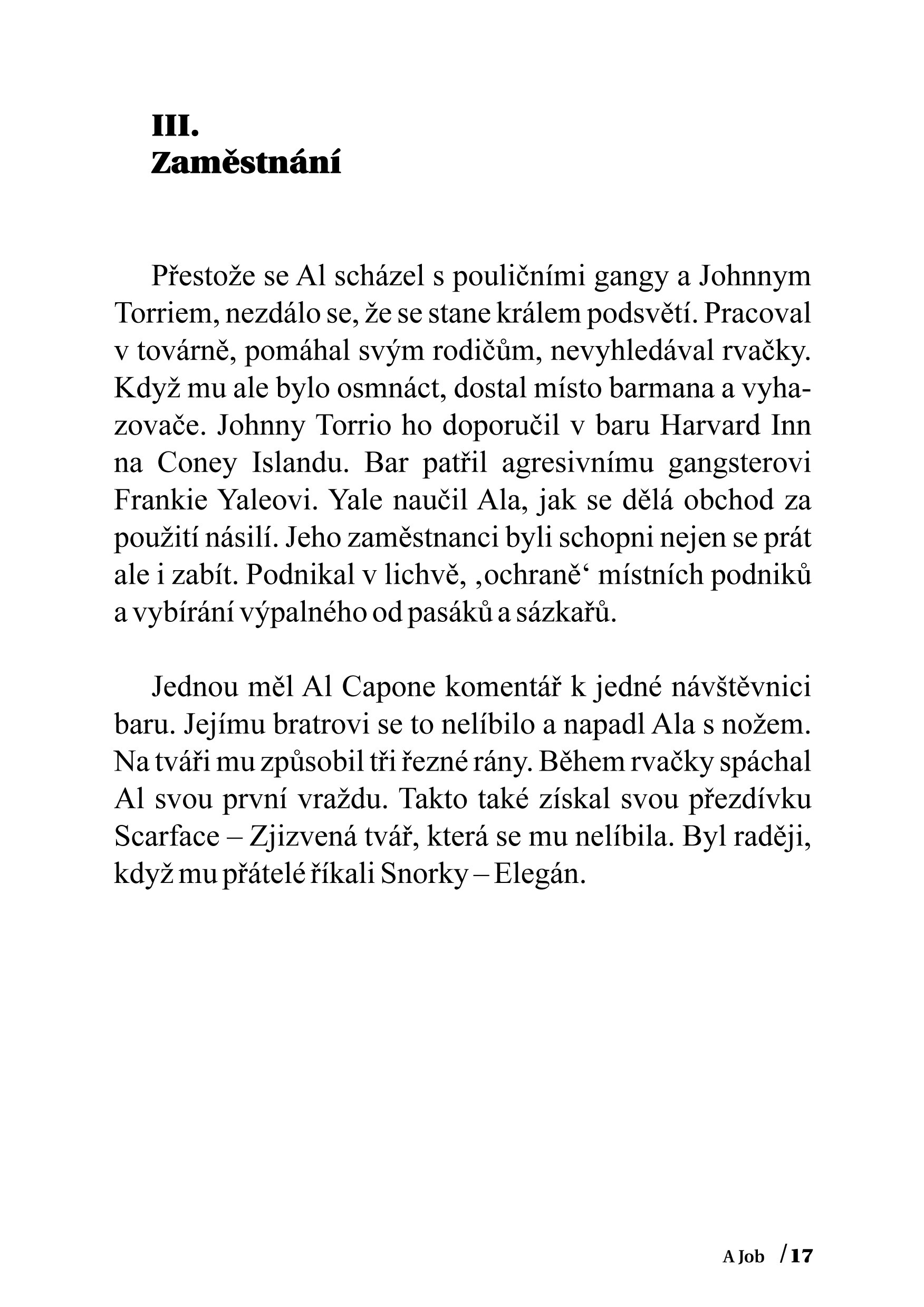 Jaký byl Al Capone? Byl to převážně chladnokrevný vrah, tvrdý byznysmen nebo milující otec a filantrop? Byl by tím, čím byl, kdyby nebylo prohibičního zákona? To se snaží prozkoumat tato publikace. O co se však kniha snaží především, je zdokonalení vaší znalosti angličtiny. Text je psaný jednoduchým jazykem, jehož porozumění vám pomůže zkontrolovat zrcadlový překlad. Po každé kapitole naleznete okomentované některé jazykové jevy, které se v textu vyskytly. Anglický text si také můžete poslechnout na přiloženém CD. CD obsahuje nahrávky ve formátu MP3. Vzadu v příloze se nachází stručný přehled anglické gramatiky.