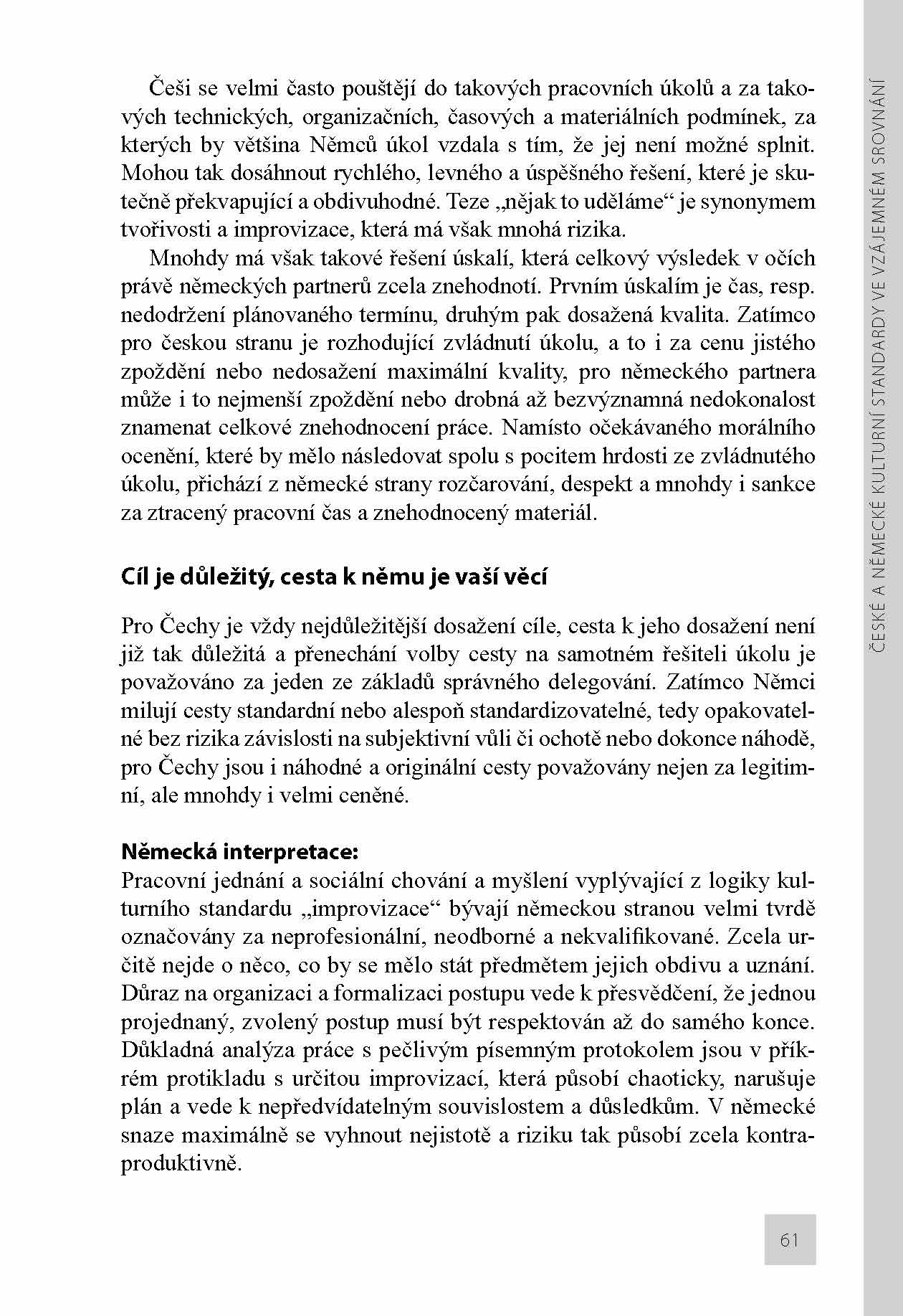 Kniha Interkulturní komunikace v řízení a podnikání: česko-německá Ivana Nového a Sylvie Schroll-Machl (nakladatelství Management Press, brož., 184 str., doporučená cena 349 Kč), významných odborníků na problematiku interkulturní psychologie a managementu nabízí kromě užitečných zásad komunikace mezi kolegy v česko-německých týmech, mezi manažery a řadovými pracovníky v česko-německých firmách a českými a německými obchodními partnery také srovnání českých kulturních standardů s kulturními standardy německými. Jejich vysvětlení a pochopení zmírňuje často jen obtížně překonatelné předsudky a stereotypy, vede k přímější a jednoznačnější komunikaci a ve svém důsledku i k úspěšnější a příjemnější spolupráci. Překonávání těchto předsudků, vzájemných konfliktů a nedorozumění demonstrují autoři na mnoha příkladech z česko-německé praxe, na řadě případových studií i na zkušenostech a ukázkách z interkulturních tréninků v česko-německých firmách. Dokazují, že úspěch interkulturní komunikace nespočívá jen v dobré znalosti cizího jazyka a ve schopnosti dobře se orientovat v jeho odborné terminologii, ale tkví rovněž v dobré znalosti kultury a zejména kulturních odlišností komunikačních partnerů.
