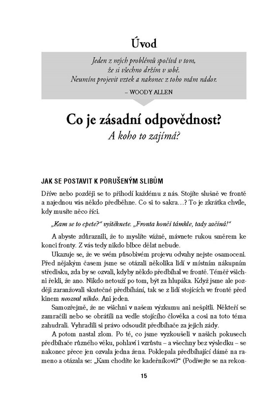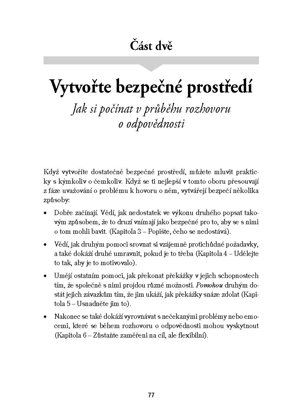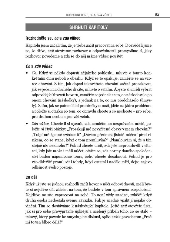 Kniha vás krok za krokem provede prověřenými metodami, jak se vyrovnat s problematikou nesplněných slibů a nedodržených závazků, aniž by to zničilo vztahy – nýbrž naopak, do budoucna je posílilo. Zkušení autoři strávili desetitisíce hodin sledováním nejúspěšnějších mistrů těchto vrcholně obtížných situací a vypracovali spolehlivou metodiku, jak je zvládat. Nepostradatelná pomůcka pro rodiče, učitele, manažery, vychovatele, mediátory, kouče a vůbec všechny, kteří pracují s lidmi.