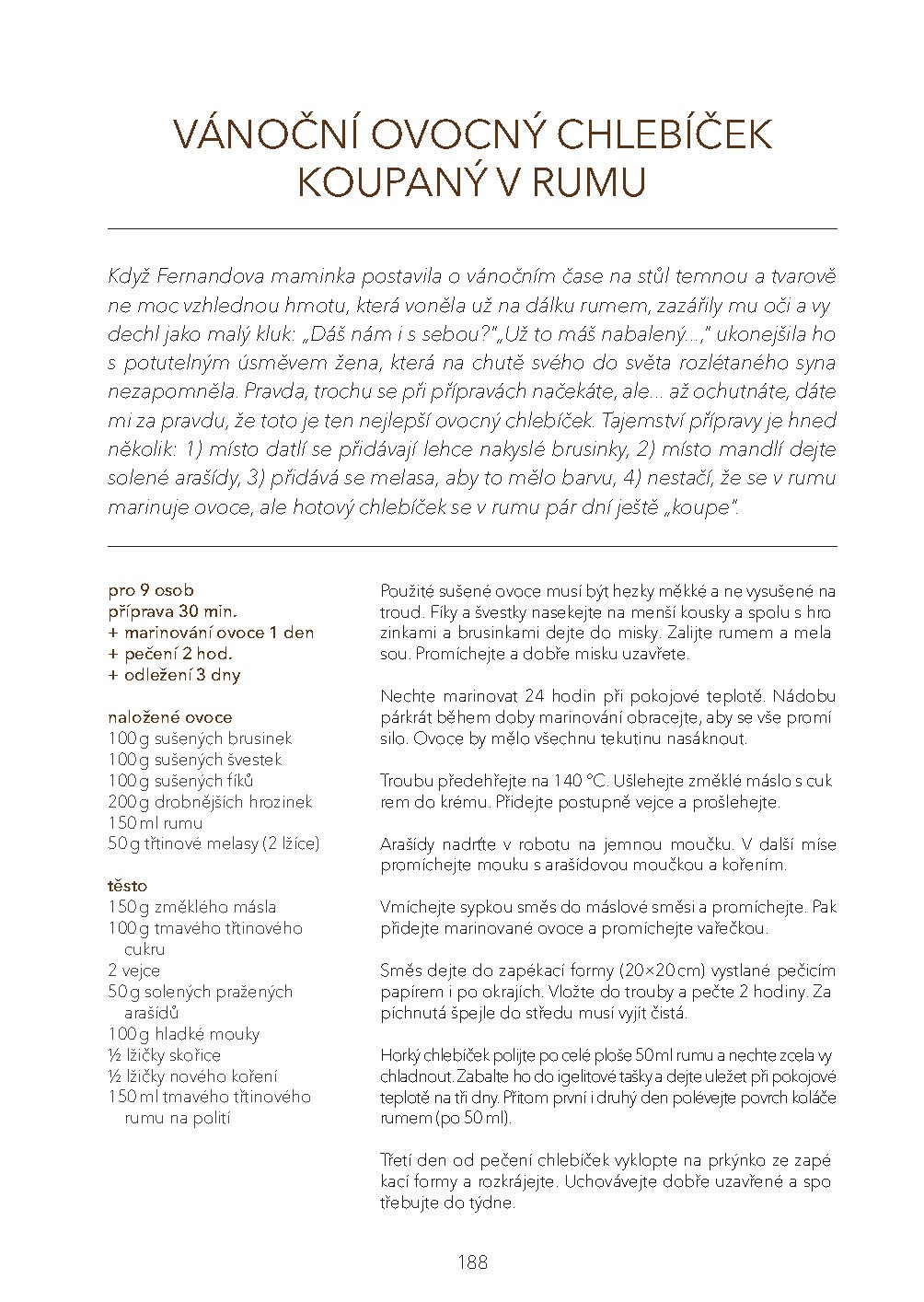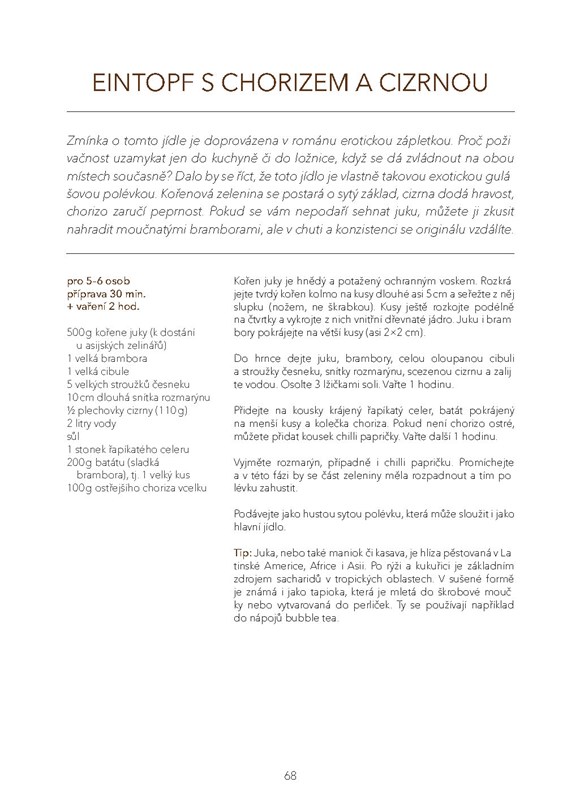 Recepty inspirované románem Muž s vůní kávy, žena se špetkou skořice voní nejen po těchto dvou surovinách, ale i po koriandru, limetkách, rumu nebo kokosovém mléku. Zároveň tu má prostor i česká klasika, která s mírným vyšperkováním dokáže očarovat cizince i Čecha jako poleno.