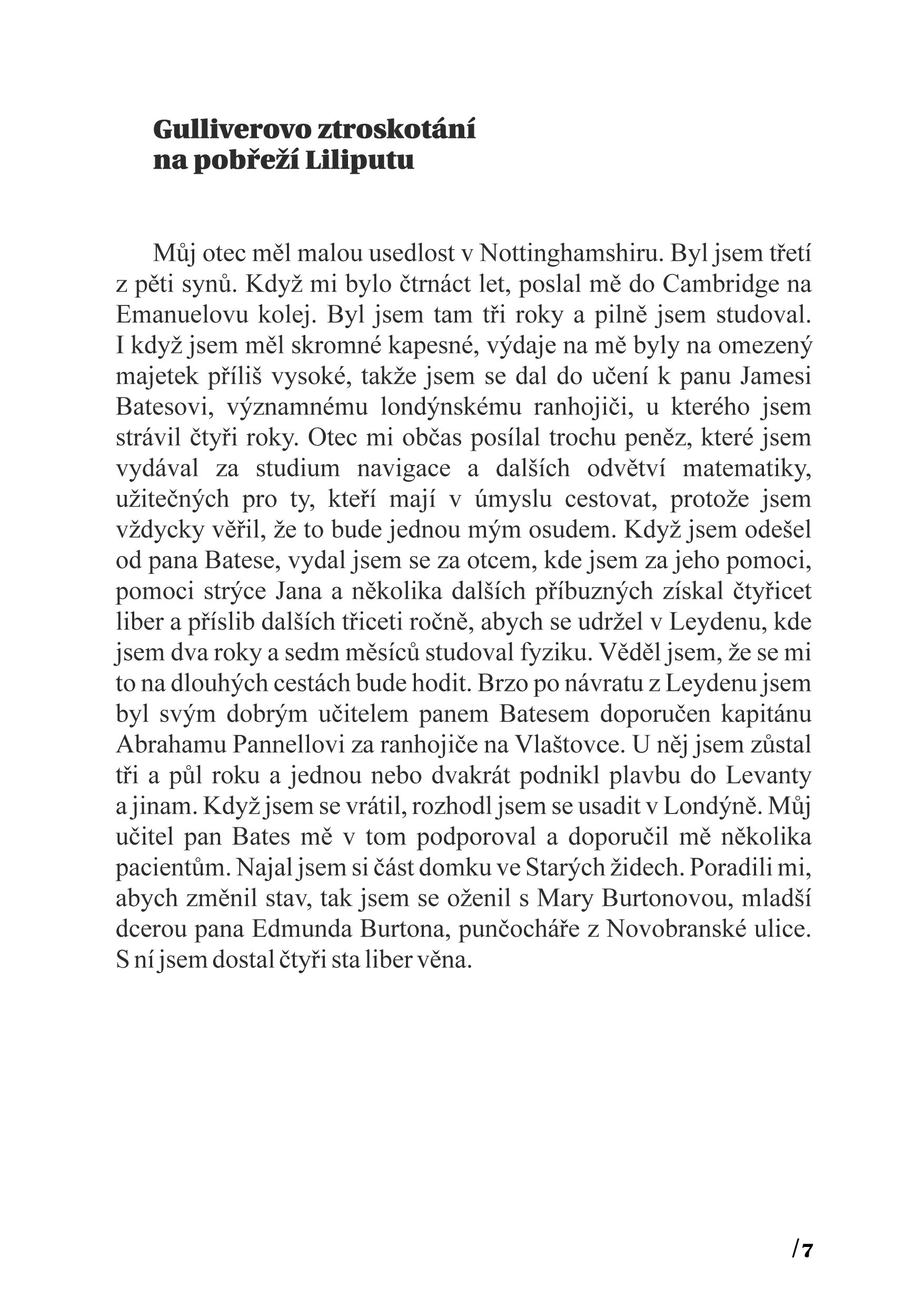 Přinášíme vám první a známější dvě části tohoto satirického pojednání o lidské povaze a zároveň parodie na tehdejší cestopisy – Cestu mezi trpaslíky žijící v zemi Lilliput a cestu k obrům z Brobdingangu.
