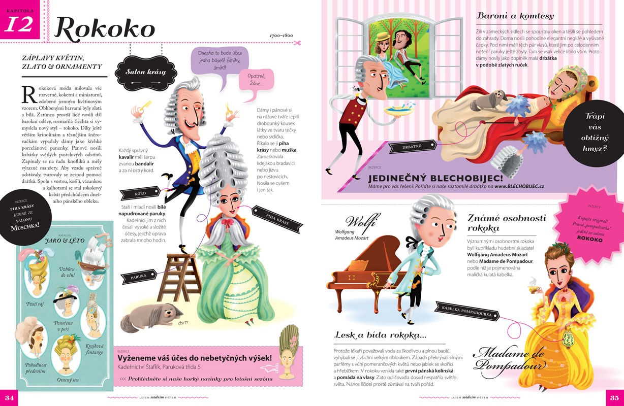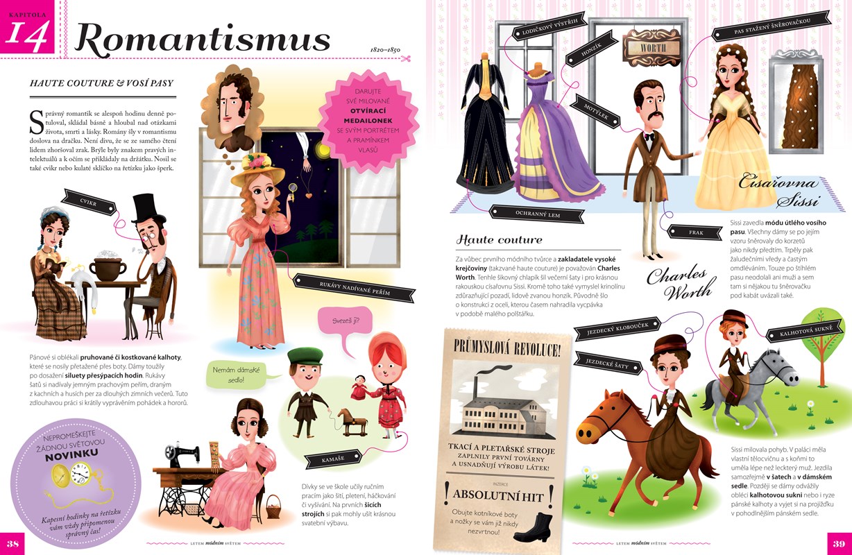 Průvodce světem módy provede všechny malé parádnice a parádníky od osmi let historií odívání od pravěku až po dnešní dny. Dvacet čtyři bohatě ilustrovaných kapitol je nechá nahlédnout do dámských, pánských i dětských šatníků. Kromě nejdůležitějších módních kousků, které se objevily v průběhu staletí, se čtenáři seznámí s významnými módními tvůrci i ikonami, které určovaly trendy. Nechybí ani přehledy vývoje svatebních šatů, plavek, obuvi, klobouků či účesů.