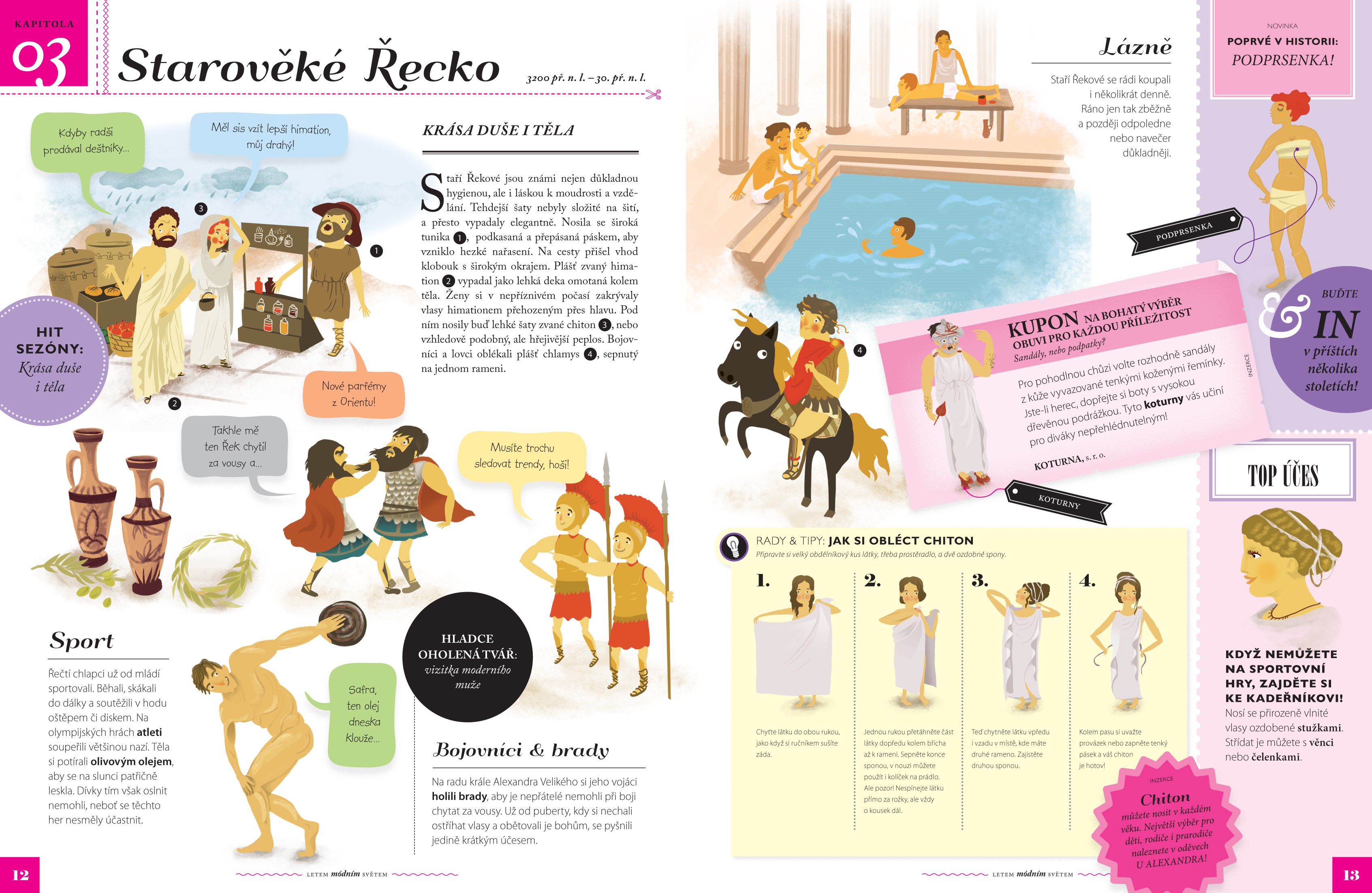 Bohatě ilustrovaný průvodce historie odívání od pravěku po současné trendy. Pojď se podívat, jak se oděvy vyvíjely v průběhu staletí, kdy naši předci vynalezli jehlu či zip, a hlavně – co s nimi dokázali! Dozvíš se, kdy se ženy začaly malovat, že podpatky se nosily už ve starověkém Egyptě i že sukně dříve tvořily běžnou součást pánského šatníku. A nezapomeneme ani na to, jak se z pracovních kalhot stal hit – džíny!