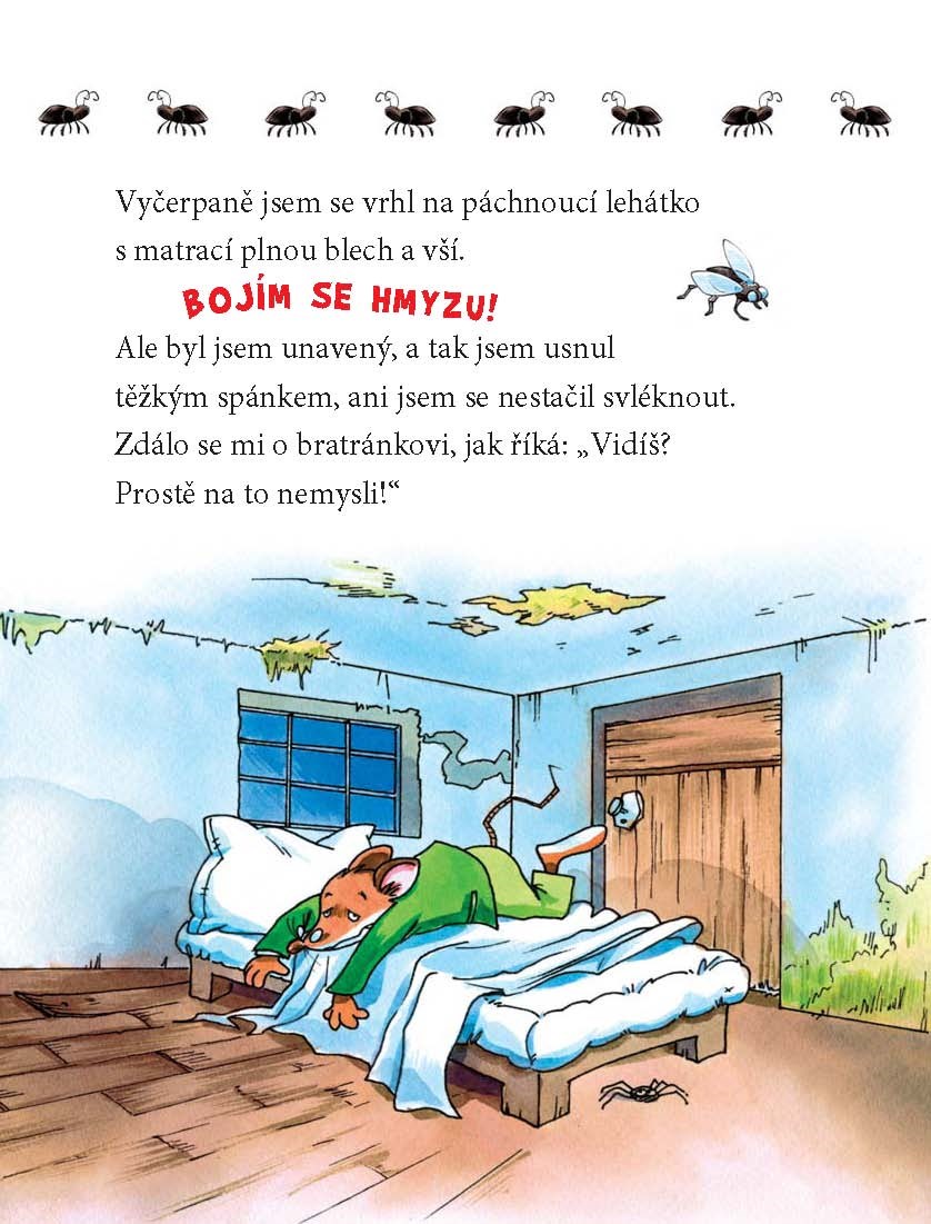 Vážení přátelé hlodavci, čekají vás další MYŠPARÁDNÍ DOBRODRUŽSTVÍ Geronima Stiltona. Jak již víte z prvního dílu Geronimo je velice výjimečný myšák, který žije v Myšákově na podivuhodném Myším ostrově a ve volném čase sbírá historické kůrky od parmazánu z 18. století, ale hlavně strašně rád píše knihy, v nichž vypráví o svých příhodách. Tentokrát však na sbírání kůrek nebude mít ani vteřinku, ocitne se nečekaně v Černé džungli a bude muset bojovat o holý život. V příběhu se to hemží pavouky, jedovatými hady a nebezpečnými škorpióny! Budete se zajíkat strachy, ale nebojte, ani břichobol od smíchu není vyloučen.