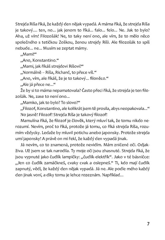 Malá Konstantina je docela obyčejná holčička. Má ráda slova, vůně, vítr ve vlasech a procházky se strýčkem Ríšou. Jenže na svět, který ji tak fascinuje, nevidí. Konstantina ale vše bere s humorem a nadhledem a vůbec neví, proč by ji měl někdo litovat. Barvy si sice tak docela představit neumí, ale dny v týdnu bezpečně pozná podle vůně. Jediné, co by doopravdy chtěla zkusit, je projet se na kole…