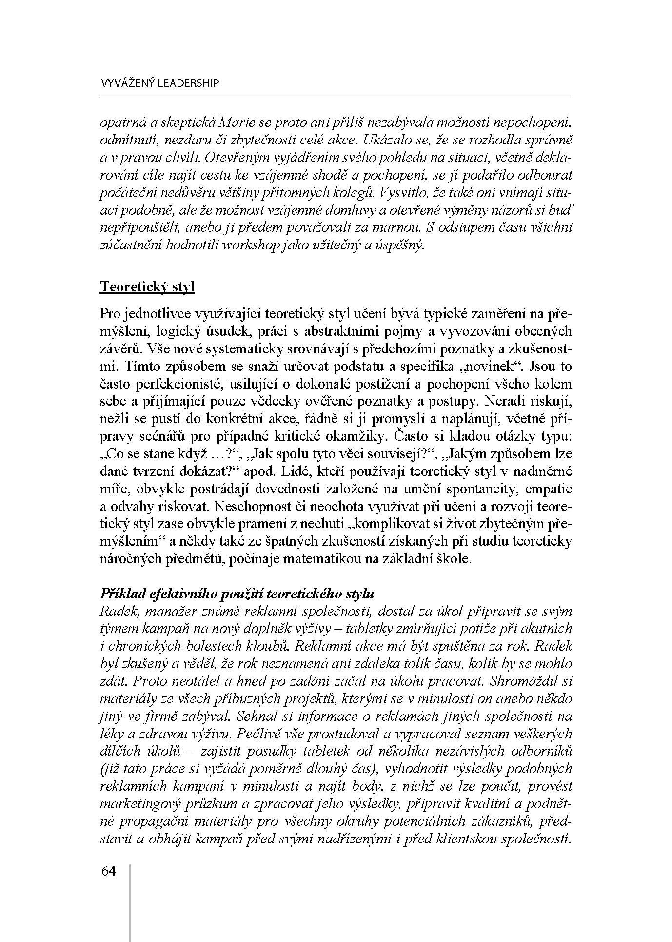 Druhé, rozšířené a aktualizované vydání je obohaceno o výsledky aplikačních výzkumných šetření doprovázené následnými návrhy vhodných intervencí pro zúčastněné organizace, které prokázaly nosnost a praktickou použitelnost principů vyváženosti v našich podmínkách. V publikaci je vyložena koncepce vyváženého leadershipu a popsány základní principy versatility. Obsahuje rovněž praktická doporučení pro odstraňování jednostranností, excesů či nedostatků leadershipu v relaci k dopadům na organizační kulturu. Principy vyváženosti jsou zde tvořivě aplikovány na vybrané sociální a manažerské dovednosti významné pro zvládání interpersonálních aspektů leadershipu. Tato orientace je výrazem odborného zaměření a praktických zkušeností autorů. Neznamená podceňování organizačních aspektů leadershipu, jakkoliv je publikace určena především čtenářům, kteří hledají inspiraci pro svoji každodenní práci s lidmi. V neposlední řadě jsou principy vyváženého leadershipu tvořivě aplikovány na vybrané sociální a manažerské dovednosti.