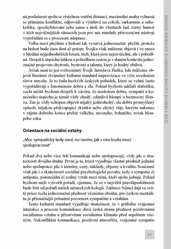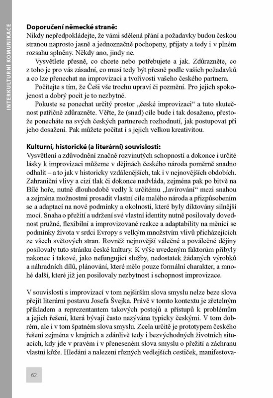 Úspěšná česko-německá autorská dvojice se ve 2. aktualizovaném vydání úspěšné monografie zaměřuje výlučně na německou a českou kulturu, resp. jejich odlišnosti, které jsou nejčastějším zdrojem vzájemných nedorozumění. Navazuje na své předchozí knihy, v nichž formulovala základní kulturní standardy české a německé kultury, a nyní tyto standardy promítá do konkrétních pracovních a manažerských situací. Vychází z rozsáhlých zkušeností z česko-německých firem a institucí a nejnovějších empirických výzkumů zaměřených na klíčové situace v managementu a personálním řízení a na různých příkladech z reálného života česko-německých firem nabízí řešení četných problémů manažerů i zaměstnanců.