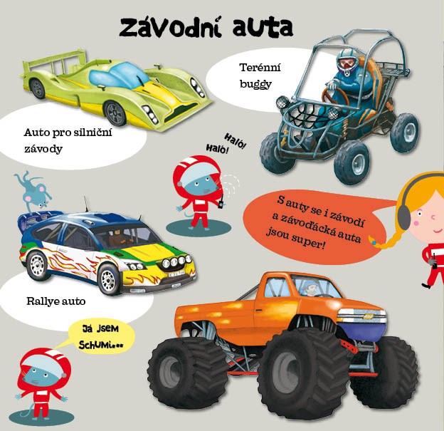Titul seznámí děti s tím, co se nachází uvnitř automobilu, k čemu vše slouží a k čemu se dnes automobily využívají. V knize si také prohlédnou moderní dopravní stroje nebo závodní auta. Vše jednoduchou a vtipnou formou vhodnou pro tuto věkovou kategorii čtenáře. Díky nápaditému designu se pod průhlednou obálkou skrývá model formule vytvořený z jednotlivých tvarově vyseknutých stran. Modelem lze navíc listovat, stejně jako zbývajícími stránkami knihy.