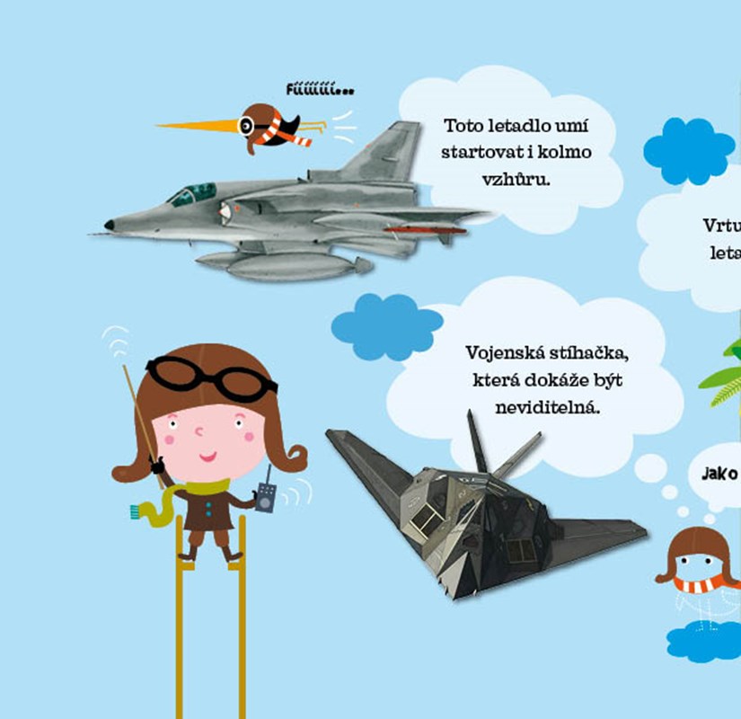 Čtenáři se dozví jak vypadala letadla před sto léty, k čemu slouží letadla dnes a jak vypadají. V knize děti také najdou informace o tom, jak vypadá dnešní letiště a k čemu slouží helikoptéry nebo jak vypadá kokpit velkého dopravního letounu. Vše jednoduchou a vtipnou formou vhodnou pro tuto věkovou kategorii čtenáře. Díky nápaditému designu se pod průhlednou obálkou skrývá model dvouplošníku vytvořený z jednotlivých tvarově vyseknutých stran. Modelem lze navíc listovat, stejně jako zbývajícími stránkami knihy.