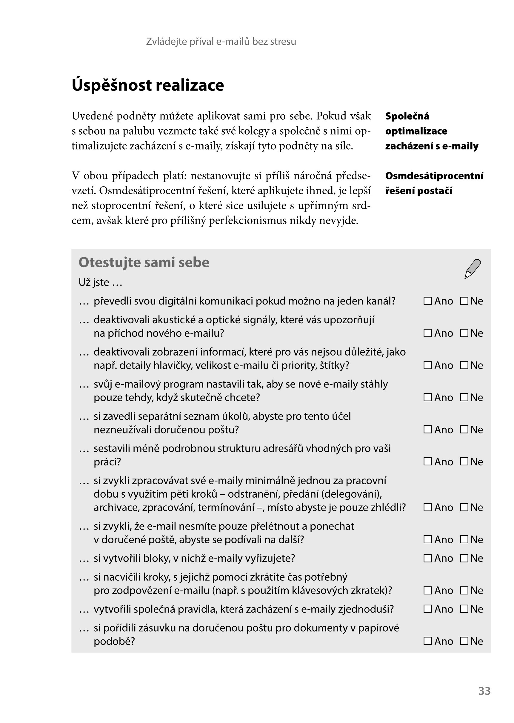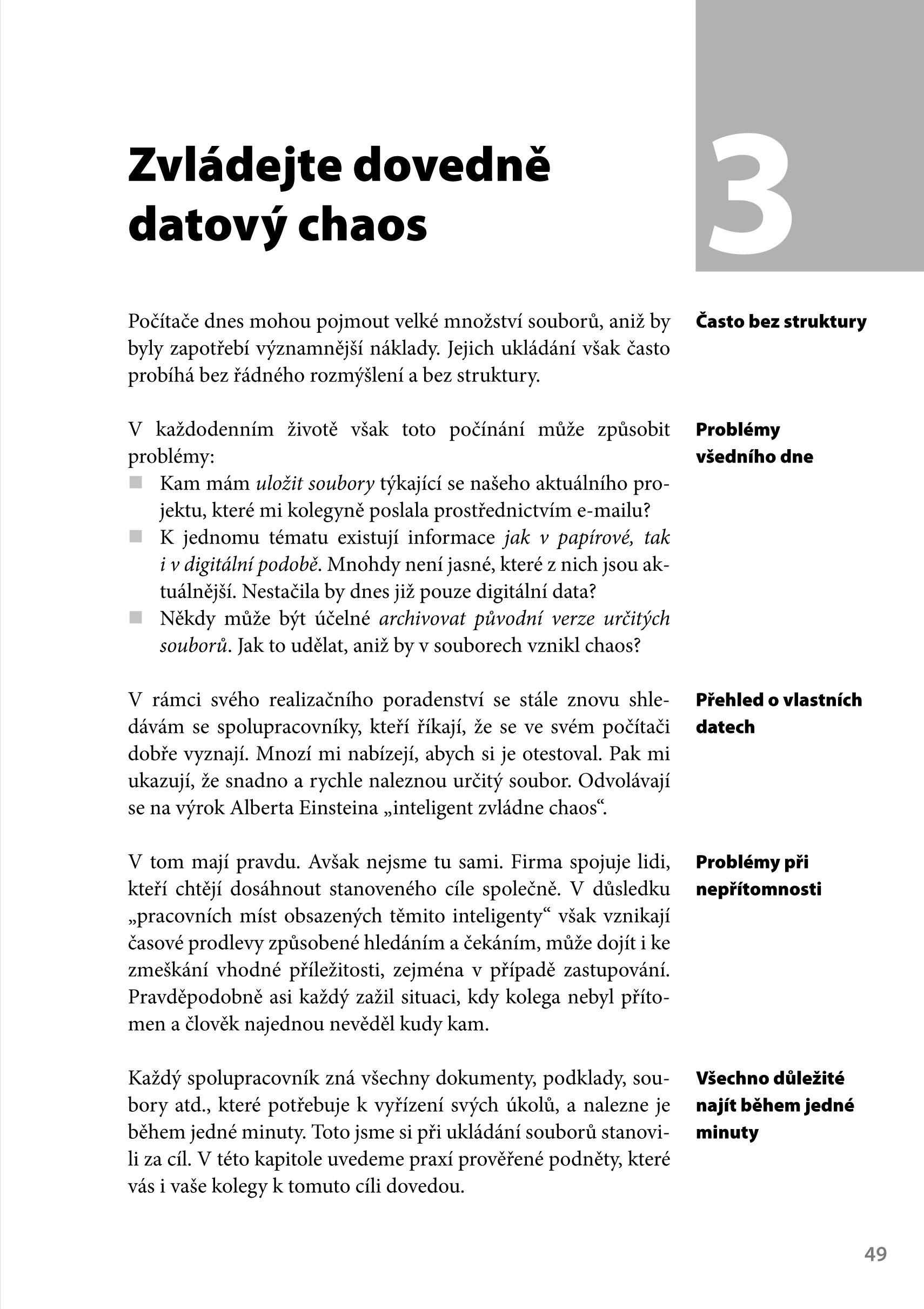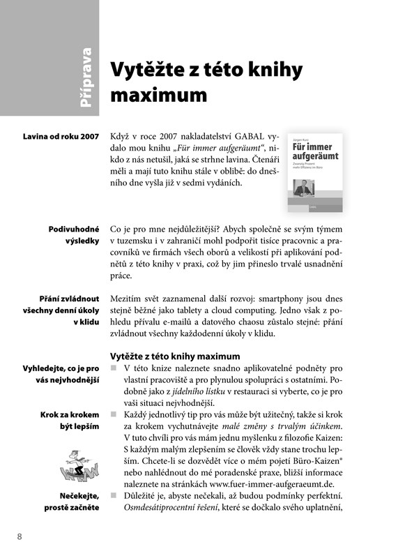 Neustále přeplněná schránka s e-maily, neuspořádané soubory v počítači, zmatek na ploše. V dnešní době, kdy na nás útočí data ze všech stran, se s těmito problémy potýkáme téměř všichni. V této knize naleznete snadno aplikovatelné podněty pro vlastní pracoviště a pro plynulou spolupráci s ostatními. Všechny tipy jsou ověřeny každodenní praxí. Budete-li se řídit těmito tipy, všechny vaše e-maily a soubory budou mít své místo a přitom toho docílíte naprosto jednoduše a pomocí pár kliknutí.