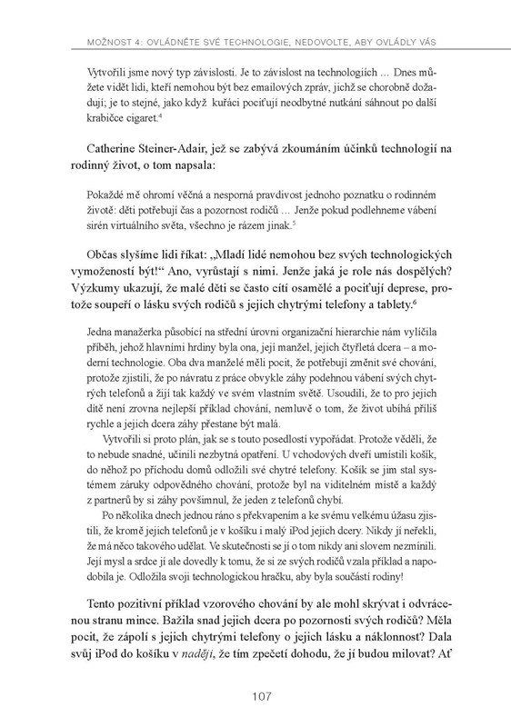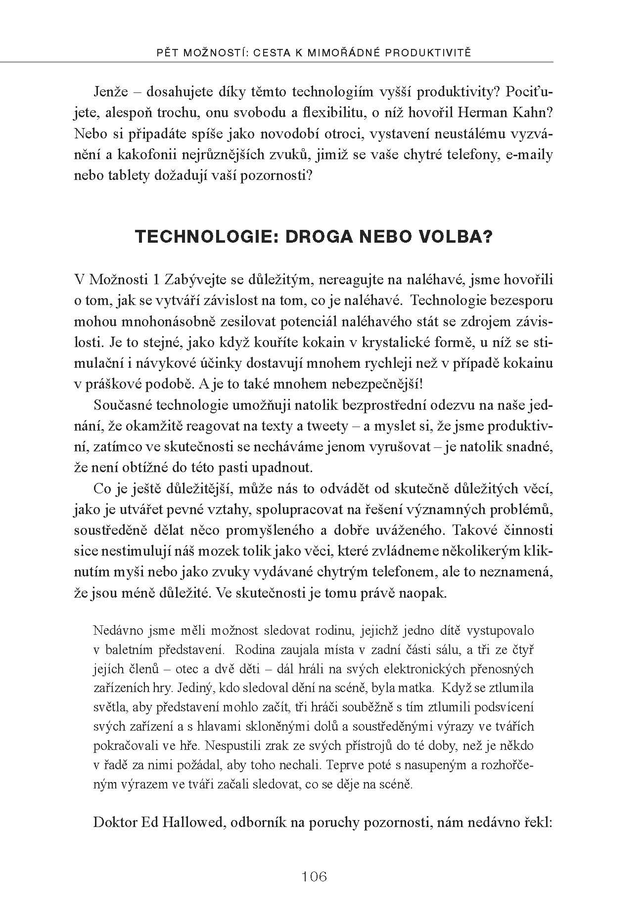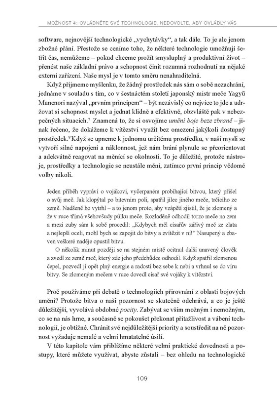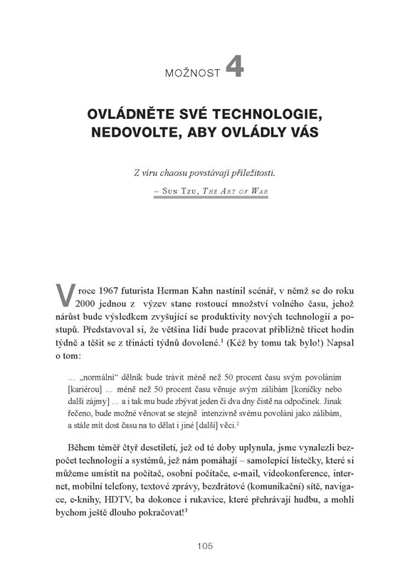 Velká pozornost je v knize věnována problematice moderních technologií. Ještě nikdy v historii nemělo lidstvo takové technologické možnosti, jako dnes. Tyto možnosti ovšem – paradoxně – mohou vést k tomu, že dosahovat věcí, které jsou pro nás důležité, může být obtížnější než kdykoli dříve. Je proto životně důležité najít správný vztah k moderním prostředkům tak, aby technologická zařízení zůstala tím, čím mají být: našimi pomocníky a nikoli našimi pány.
