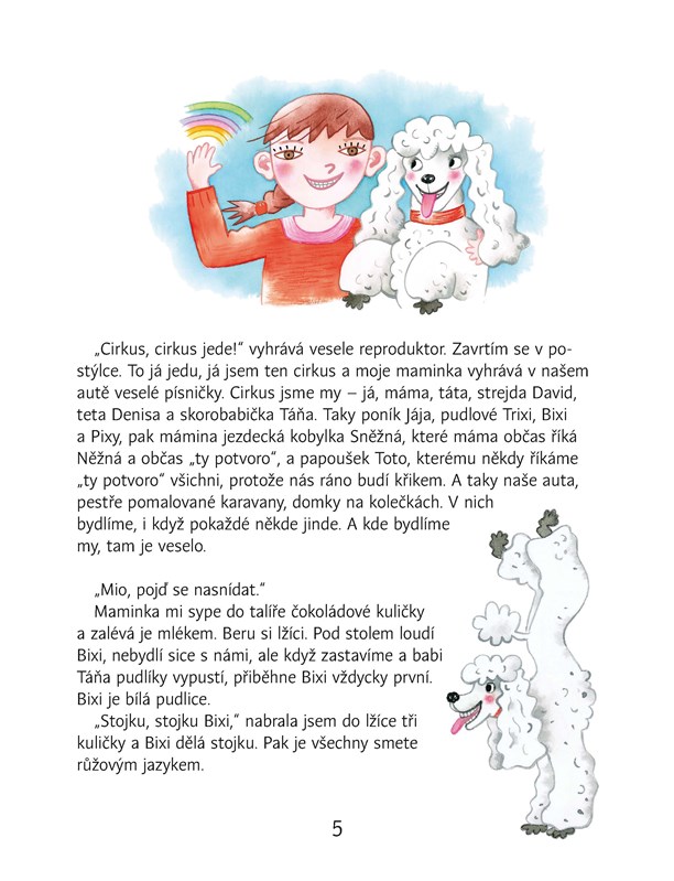 Malá Mia není jen tak ledajaká holčička, je z cirkusácké rodiny – patří k Duhovému cirkusu. Skáče salta, jezdí na poníkovi a dokáže rozveselit každé dítě i dospělé, dokonce i zvířátka. Má spoustu kamarádů a s Jonášem odvážně zachrání pudlíka Prince. Mia si ráda zpívá veselé písničky, a kdo chce, může si je zpívat společně s ní; v knize jsou hned tři, s texty a notami Štěpána Uhlíře.