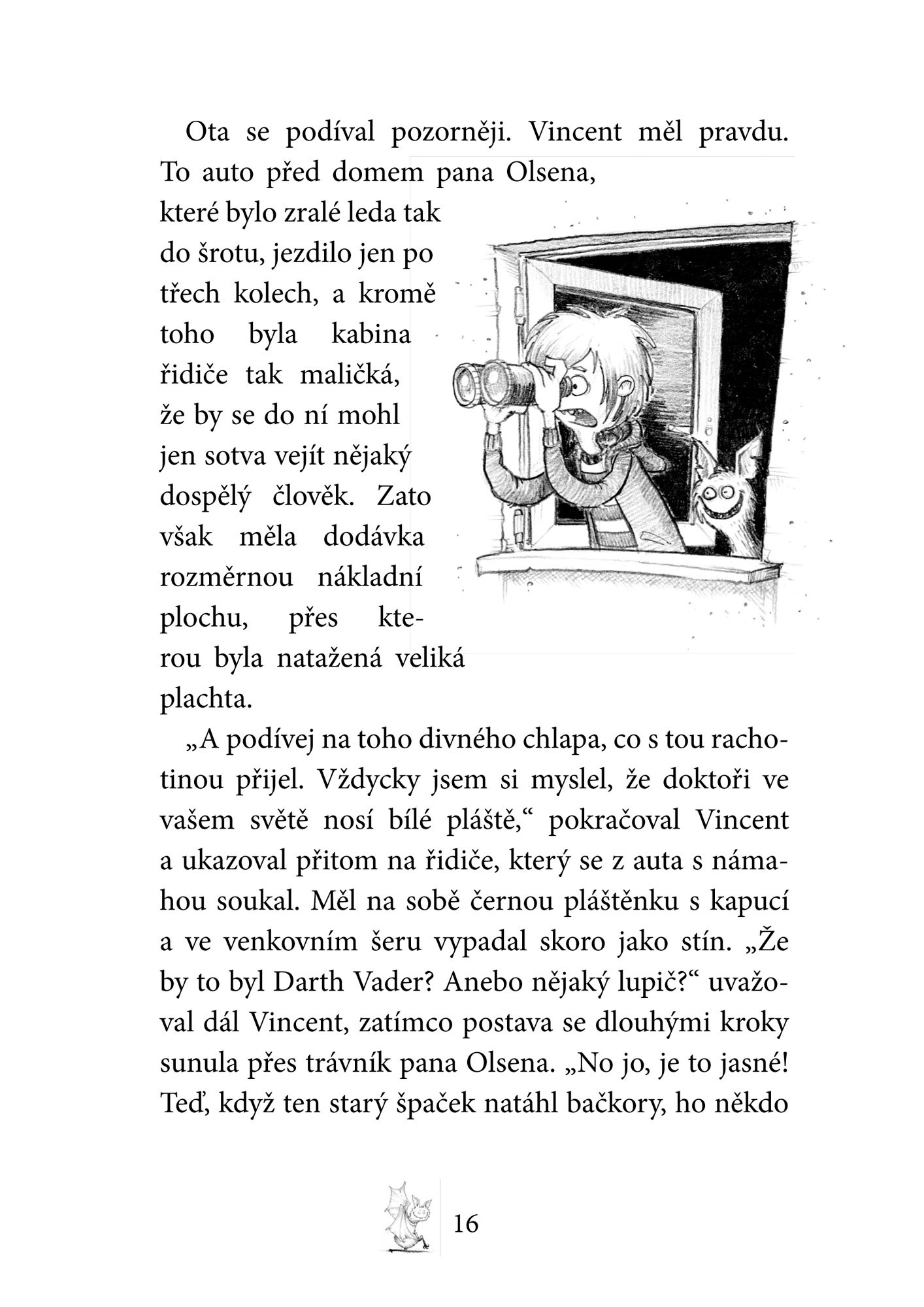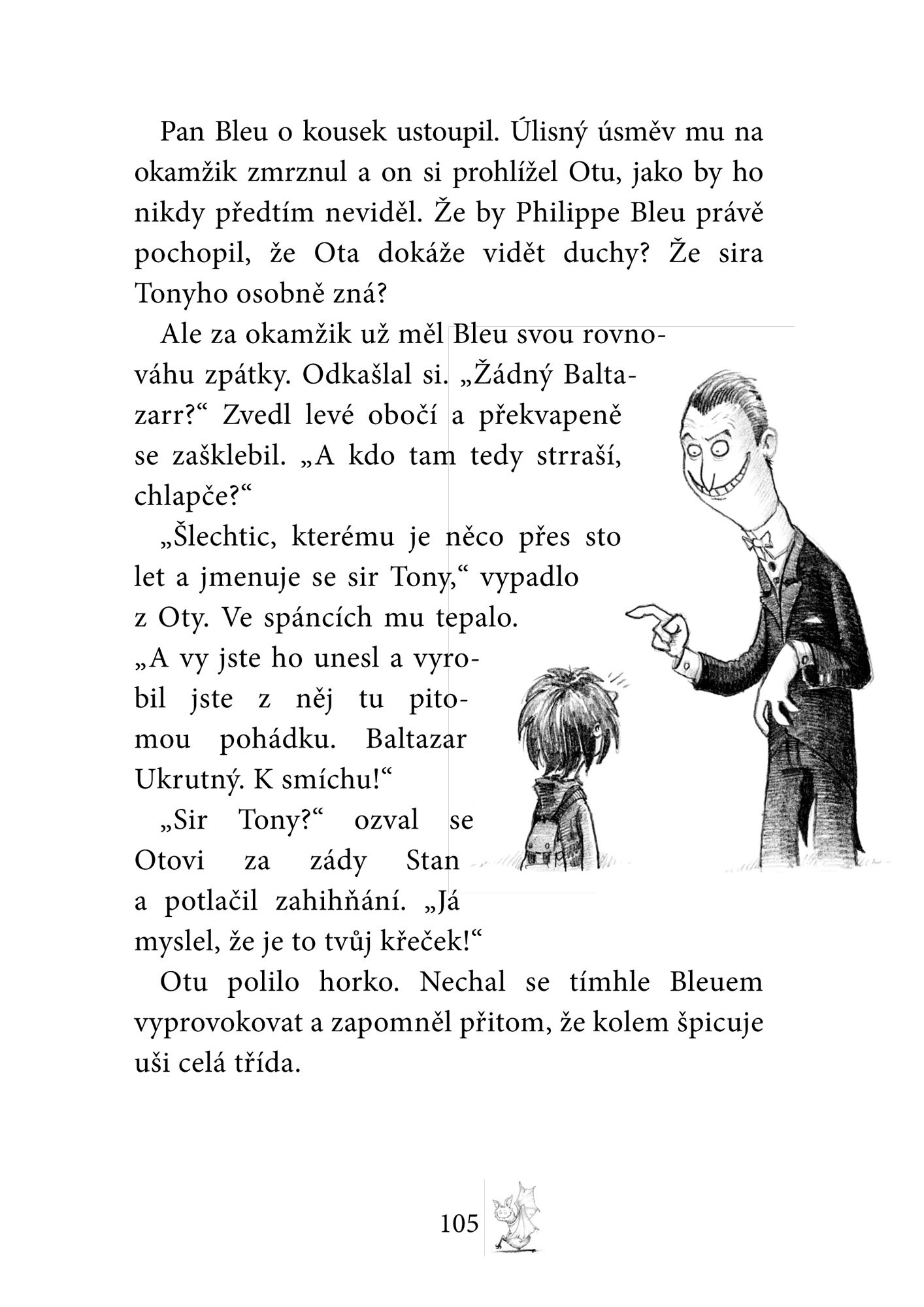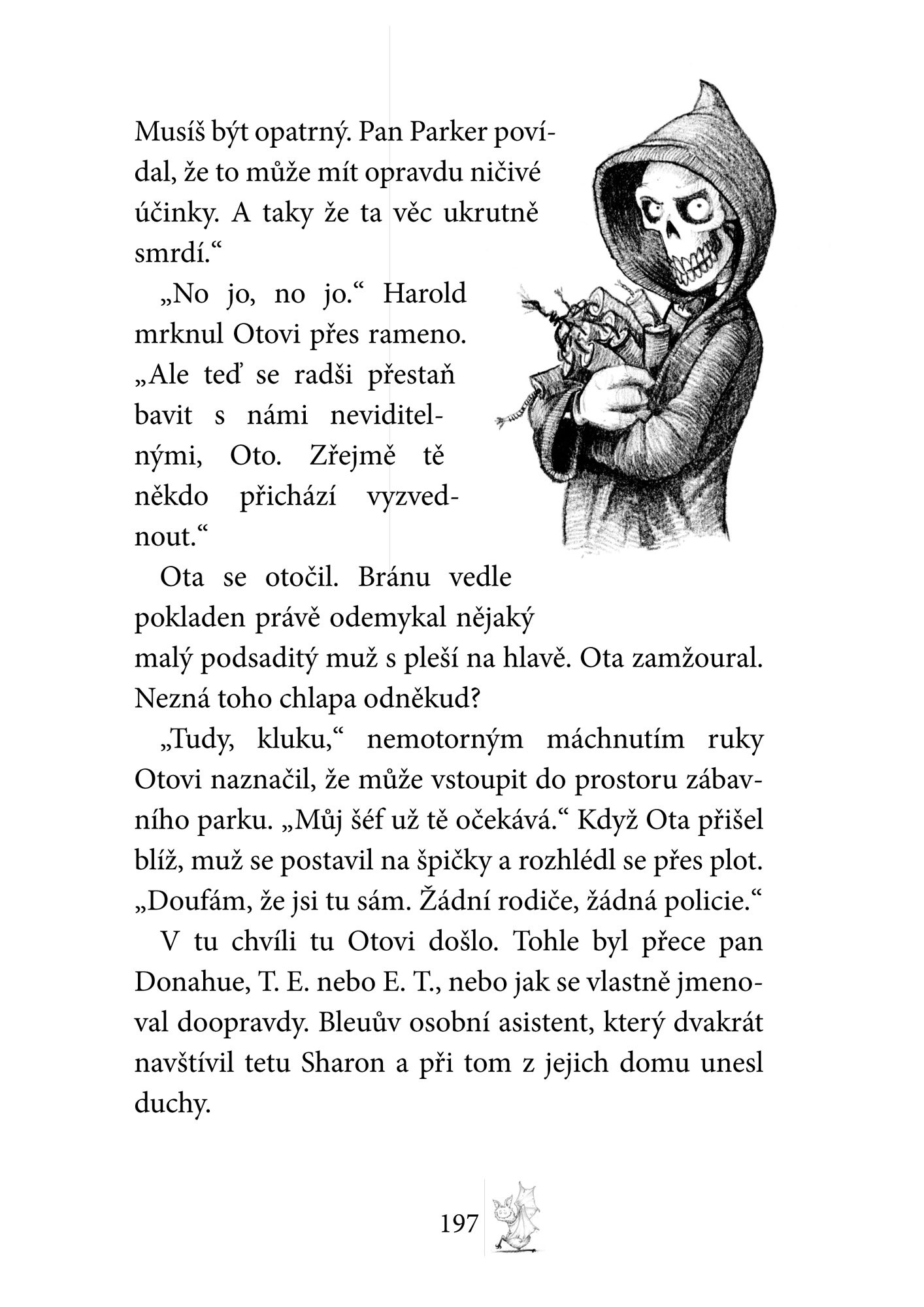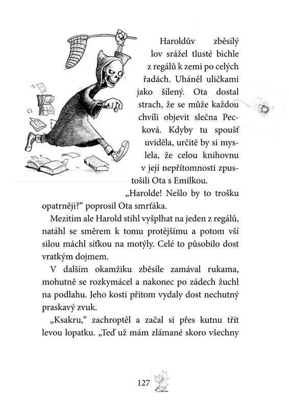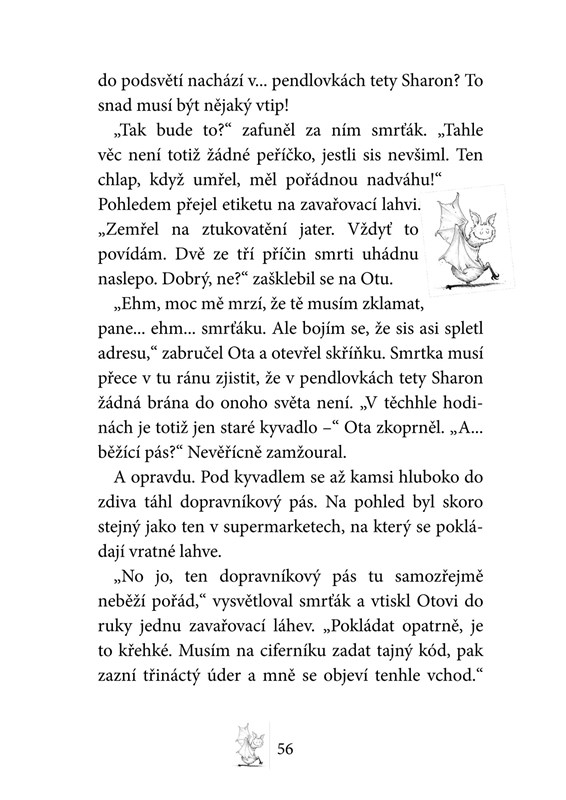 Otrava, že by z toho jeden umřel, to mi věř! Navíc nemám skoro žádnou dovolenou a ta almužna, co mi dávají místo výplaty! Vždycky si hned vzpomenu na přísloví: „Kde nic není, ani smrt nebere.“ Ještěže jsem se skamarádil s Otou a Emilkou. Sice jsou to obyčejní smrtelníci, ale na to, že jsou to jen lidi, jsou docela v pohodě. Máme teď smrtelně důležité poslání: zachránit svět před velkým zlem – nebo tak něco. Každopádně nutně musíme co nejrychleji vypátrat, kdo ukradl Otova domácího ducha.