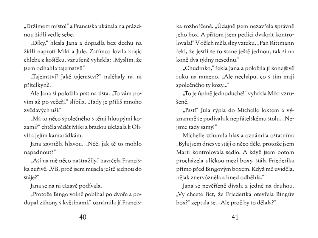 Jana se hned první den v nové škole seznámí s kamarádkami Michelle, Franciskou a Julou. Mají v plánu zúčastnit se velkého dostihového závodu, ale nejsou samy... Partička stejně starých holek má na ně spadeno a znepříjemňuje jim život, jak to jen jde. Jednoho dne však Jana najde tajuplnou kouzelnou knihu. Pomohou jim zaklínadla a lektvary proti namyšleným soupeřkám, nebo všechno ještě více zamotají?