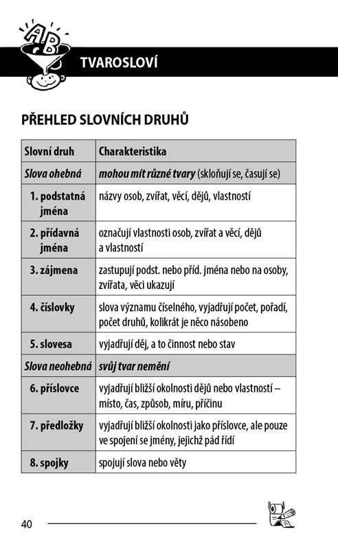 Praktická pomůcka obsahuje nejdůležitější poznatky z učiva českého jazyka. Látka je zpracována v přehledných tabulkách a schématech.