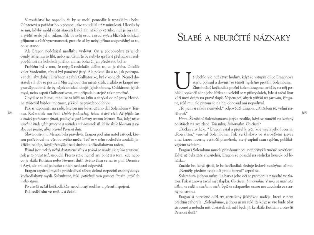 Dlouhé měsíce výcviku a bojů přinesly mnohá vítězství a naději, ale také srdcervoucí ztrátu. A ta nejtěžší bitva je přitom teprve čeká: musí se postavit samotnému Galbatorixovi. Aby zvítězili, potřebují být neskutečně silní a odvážní. Pokud to nedokážou oni, neporazí Galbatorixe nikdo. Druhá šance neexistuje.