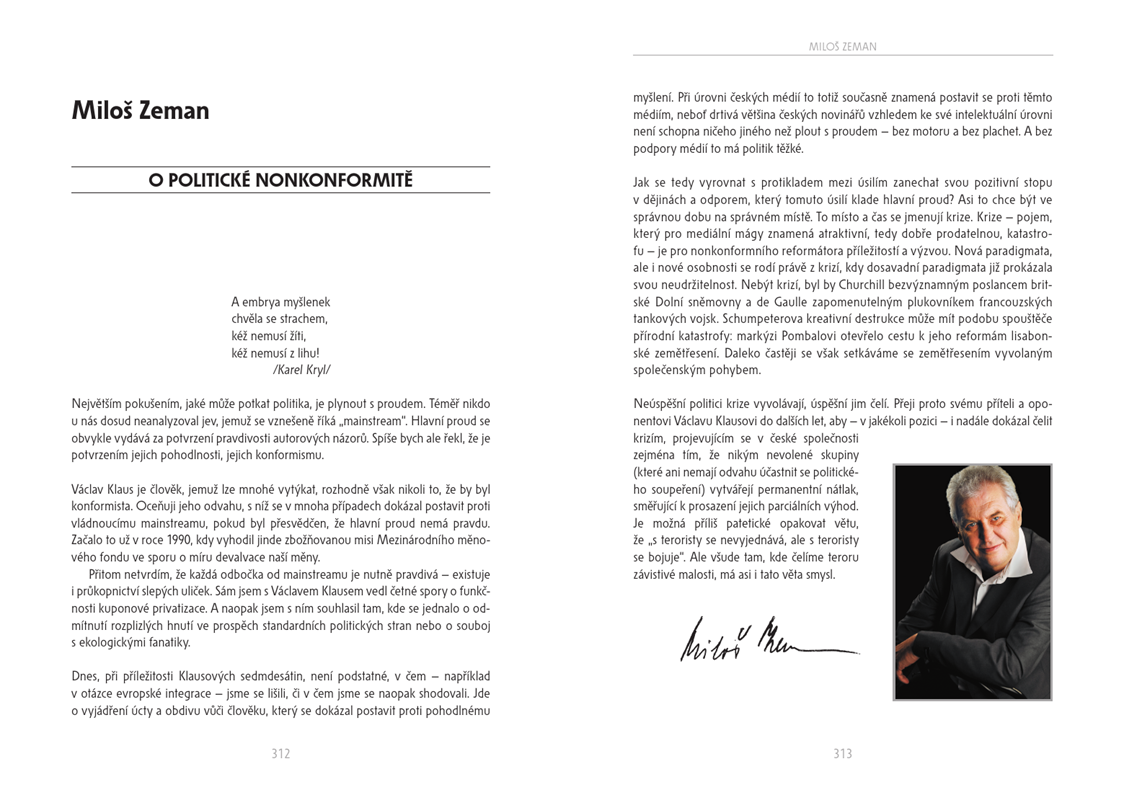 Vznikl tak jedinečný sborník textů o evropské integraci, o jednotné evropské měně, o politickém a ekonomickém vývoji v České republice, o problematice klimatických změn, o potřebě obhajoby svobody a kapitalismu, ale i o dalších tématech naší současnosti a budoucnosti.