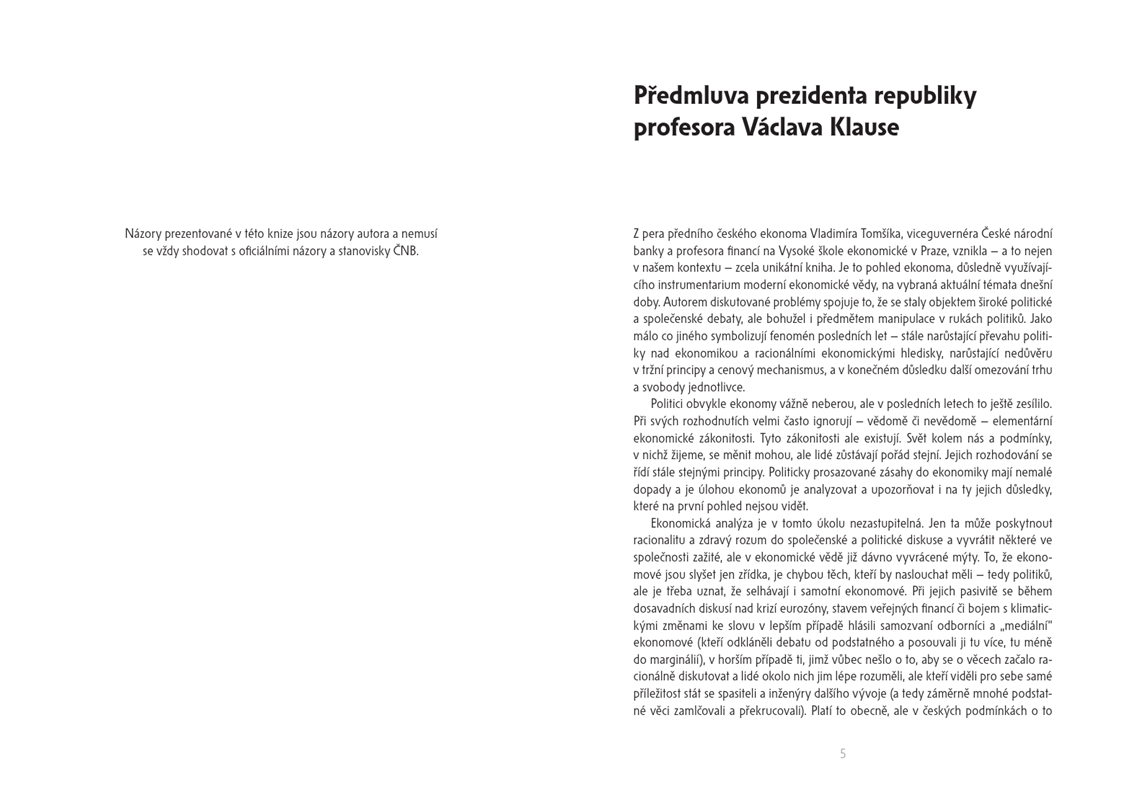 Nová kniha Ekonomie a zdravý rozum autora - viceguvernéra České národní banky - Vladimíra Tomšíka, s předmluvou prezidenta republiky Václava Klause, je pohledem ekonoma na často nepříliš racionální debatu nejenom o ekonomických tématech současné společnosti. Kniha obsahuje pět ekonomických studií a kromě toho přináší také vyjádření a odpovědi na palčivé otázky a problémy dnešní ekonomie jako společenské vědy. Zdůrazňuje potřebu návratu k tržním principům, zamýšlí se nad současnou ekonomickou krizí, která naplno vypukla v závěru roku 2008, přináší ekonomická fakta české energetiky a přírodních zdrojů a kromě jiného popisuje a vysvětluje řadu nových ekonomických jevů.