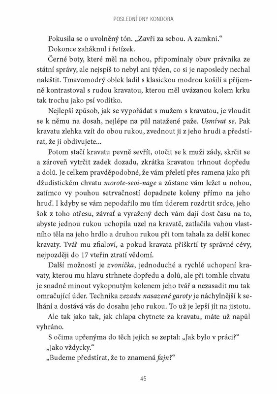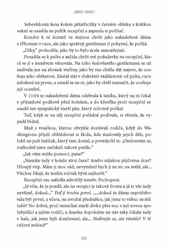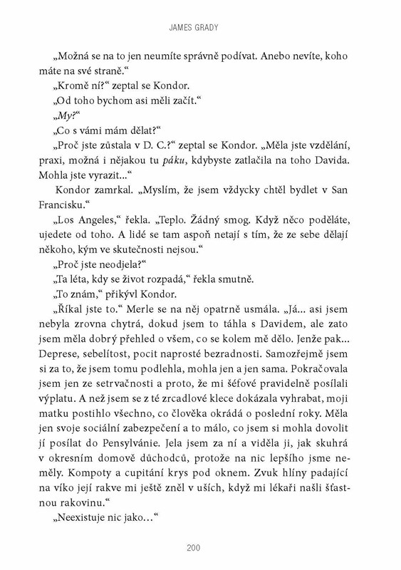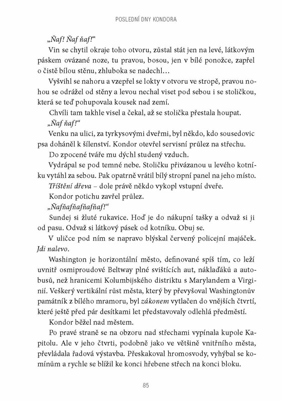 Když agentce Faye Dozierové někdo zabije parťáka v domě bývalého agenta Kondora, nejen jí se převrátí život naruby. Ve snaze odhalit skutečnou pravdu musí čelit útokům ze všech stran a najednou není jisté, komu se dá věřit. Jako jediná možnost se jeví navázat kontakt s Kondorem na útěku a nějak se k pravdě probojovat. Kdo je vrahem agenta Petera? Proč byl zavražděn právě v Kondorově domě? Když se podaří vypátrat pravdu, bude jí vůbec někdo ochoten uvěřit? A jaká cena za pravdu je už příliš vysoká? Bude stát bezpečí nejen vysloužilého agenta a agentky, která by mohla být jeho dcerou, ale i jejich nejbližších. Nebezpečí může číhat za každým rohem a v podobě kohokoli. Strhující špionážní román se odehrává v kafkovském prostředí amerického Washingtonu, D. C., ve žhavé současnosti ovlivněné útoky z 11. září 2001, v době přebujelých technologických vymožeností.