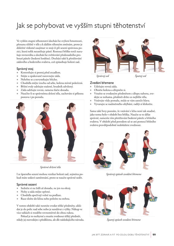 - Doporučené pohybové aktivity v těhotenství, výživu, potravinové doplňky, možnosti oblékání, jak a zda cestovat, pomůcky, přírodní prostředky a způsoby ulevující těhotenským obtížím.