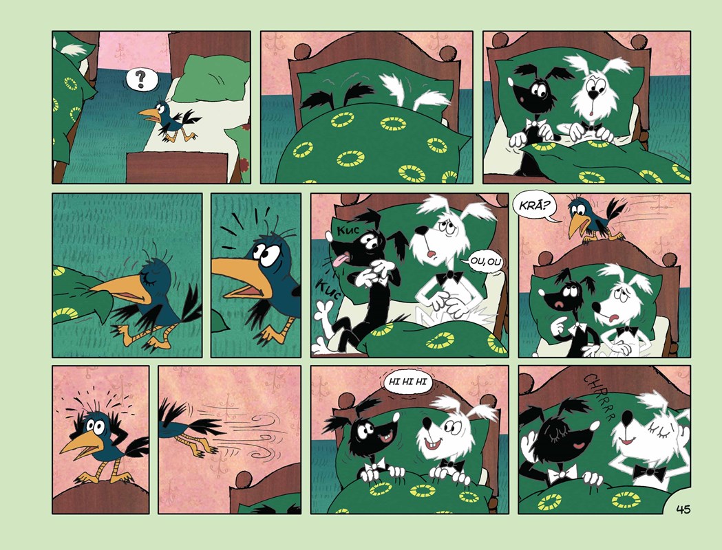 Podle večerníčku Martina Otevřela a Jiřího Munka, s obrázky Zdeňka Smetany za autorské spolupráce Marii Axamitové, nakreslil a napsal Martin Otevřel. Štaflík a Špagetka bydlí v chaloupce a je jim spolu dobře. Ráno se jim ale nikdy nechce vstávat. Jenže na střeše za komínem bydlí ještě poťouchlá vrána, známé ranní ptáče, takže je nikdy dlouho spát nenechá. Každý den vymýšlí, jakou lumpárnu by jim vyvedla.