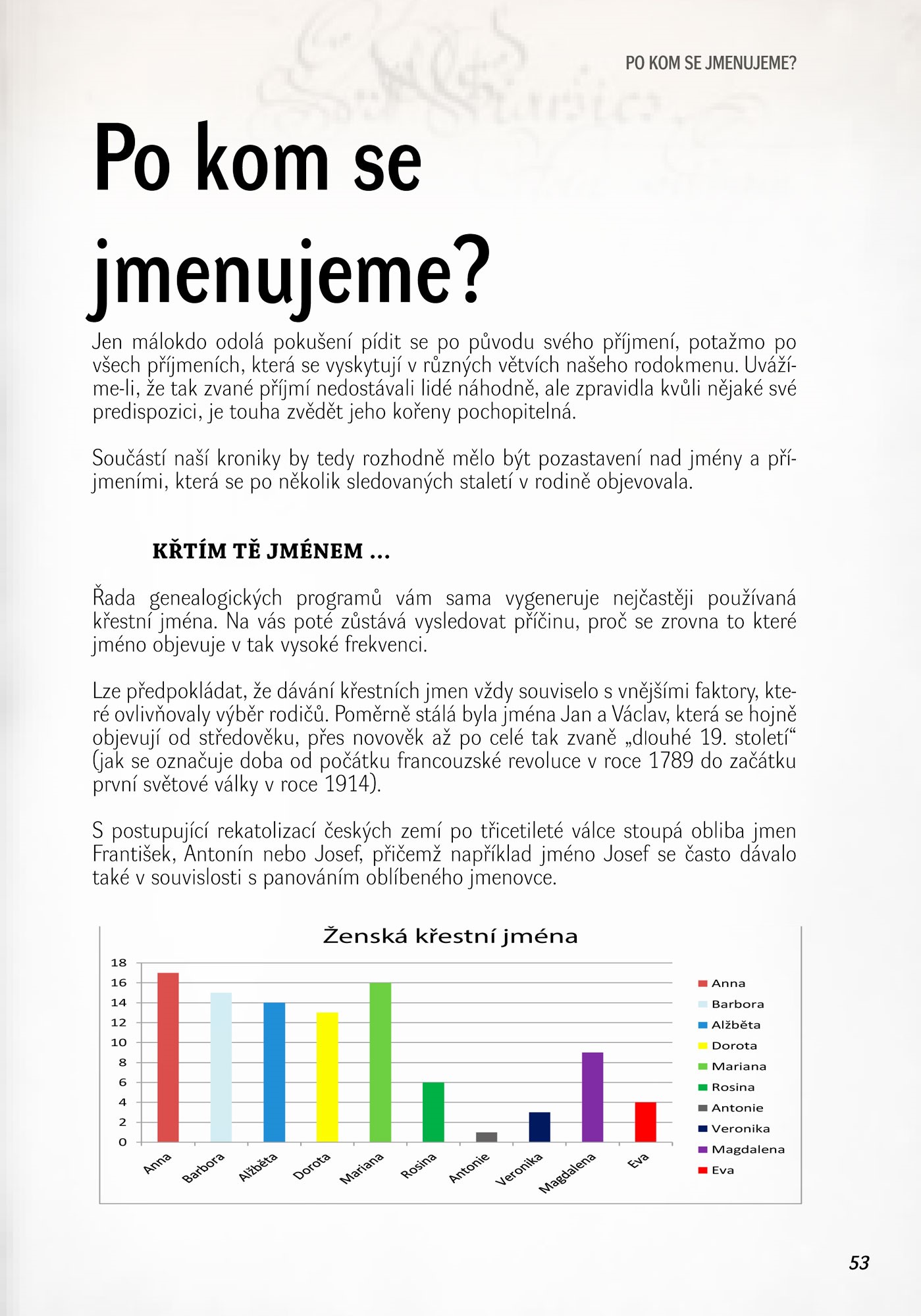Pomůže vám od prvních krůčků v samotném začátku sepisování, s určováním toku příběhu, s tím, jak přehledně představit jednotlivé členy rodu i jak text obohatit dalšími rozšiřujícími informacemi, statistikami a grafickými přehledy tak, abyste ve výsledku vytvořili přehlednou a ucelenou rodinnou kroniku.