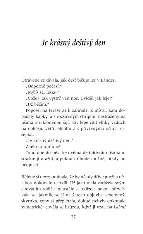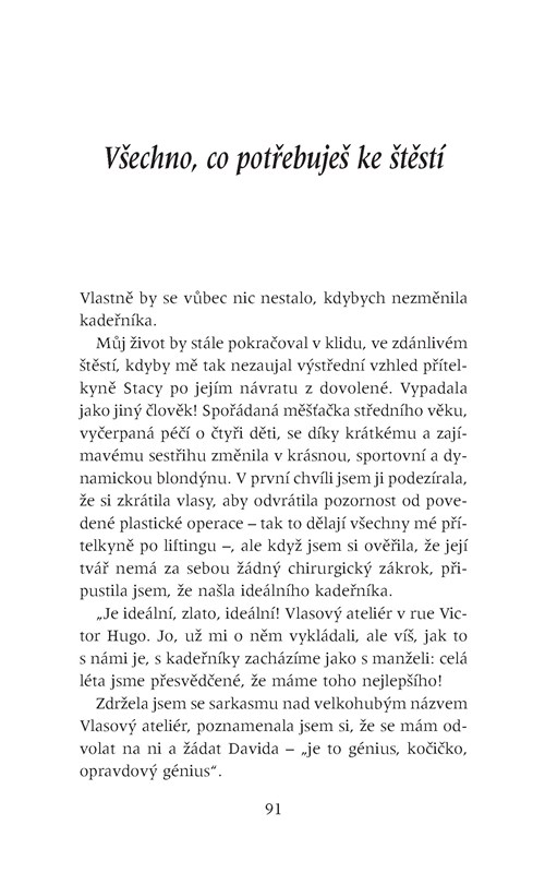Všechno, co potřebuješ ke štěstí. Existuje věta, jakou bych slyšela častěji? Říkají to lidi také někomu jinému, nebo si ji rezervují jenom pro mne? Jakmile se odvážím sebemenšího projevu nespokojenosti, už to mám na talíři: „Máš všechno, co potřebuješ ke štěstí.“ Jako by mi křičeli do tváře: zmlkni, nemáš právo si stěžovat, načež mi přibouchnou dveře před nosem.