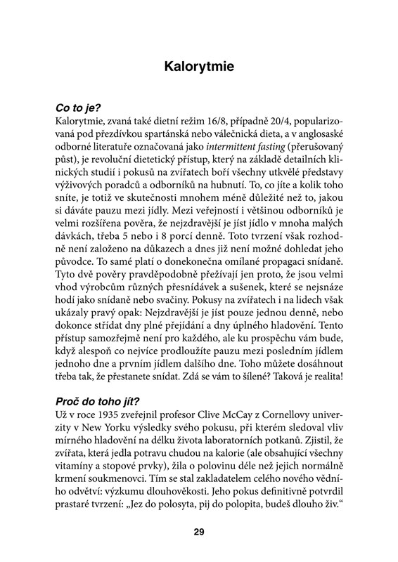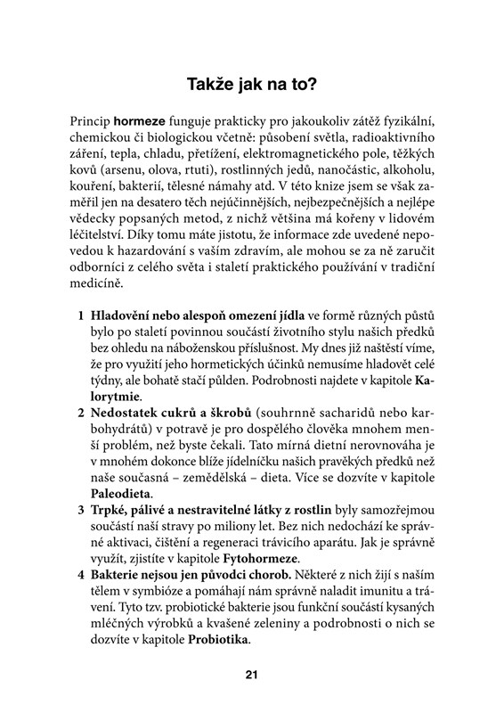 Základem této knihy jsou nejmodernější vědecké poznatky, které respektují individualitu a skutečnou biologickou podstatu člověka. Jsou součástí konceptu hormeze, tedy příznivého působení malých dávek stresu, který se v posledních 10 letech stává vědeckým hitem, díky schopnosti prodlužovat život a léčit civilizační choroby. Tato kniha se nezakládá jen na moderních mýtech, tisíckrát omílaných tvrzení nebo esoterice. Doporučení vyplývající z výzkumu hormeze jsou tak nová a neotřelá, že se často dostávají do rozporu s tím, co se můžete dočíst v časopisech, nebo čím vás krmí samozvaní odborníci v televizi. I proto může být tato kniha pomyslným elixírem, který změní vaše životy k lepšímu.