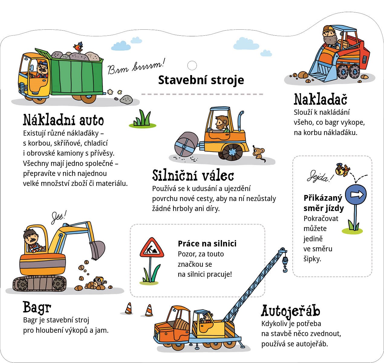 Všechny cesty začínají hluboko v lesích. Nejdříve zlehka našlapuj po pěšince, abys nevyrušil zvířátka u krmítka. Brzy dojdeš k lesní cestě, u níž se těží dřevo. Potom uvidíš tichou venkovskou silnici, která vede do blízké vesnice. Za vesnicí začíná rušný svět náklaďáků a aut směřujících do města, ve kterém už uslyšíš hluk víceúrovňové dálnice... Šťastnou cestu!A až si celou knihu přečteš, budeš také znát nejrůznější druhy aut a nejdůležitější dopravní značky. Knihu si díky otvorům ve stránkách můžeš pověsit na zeď jako obrázek! Cesta pak povede přímo tvým pokojem.
