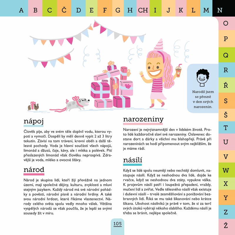 Obsahuje na osm set hesel od nejjednodušších a základních slov, s nimiž se dítě setkává od svého narození a velmi brzy chápe jejich význam (maminka, otec, babička), přes odborné pojmy z techniky, zeměpisu, biologie (automobil, cédéčko, světadíl, Austrálie, brambory, had, pavouk) až k abstraktům a filozofickým pojmům (cit, fantazie, zdvořilost, demokracie, náboženství).