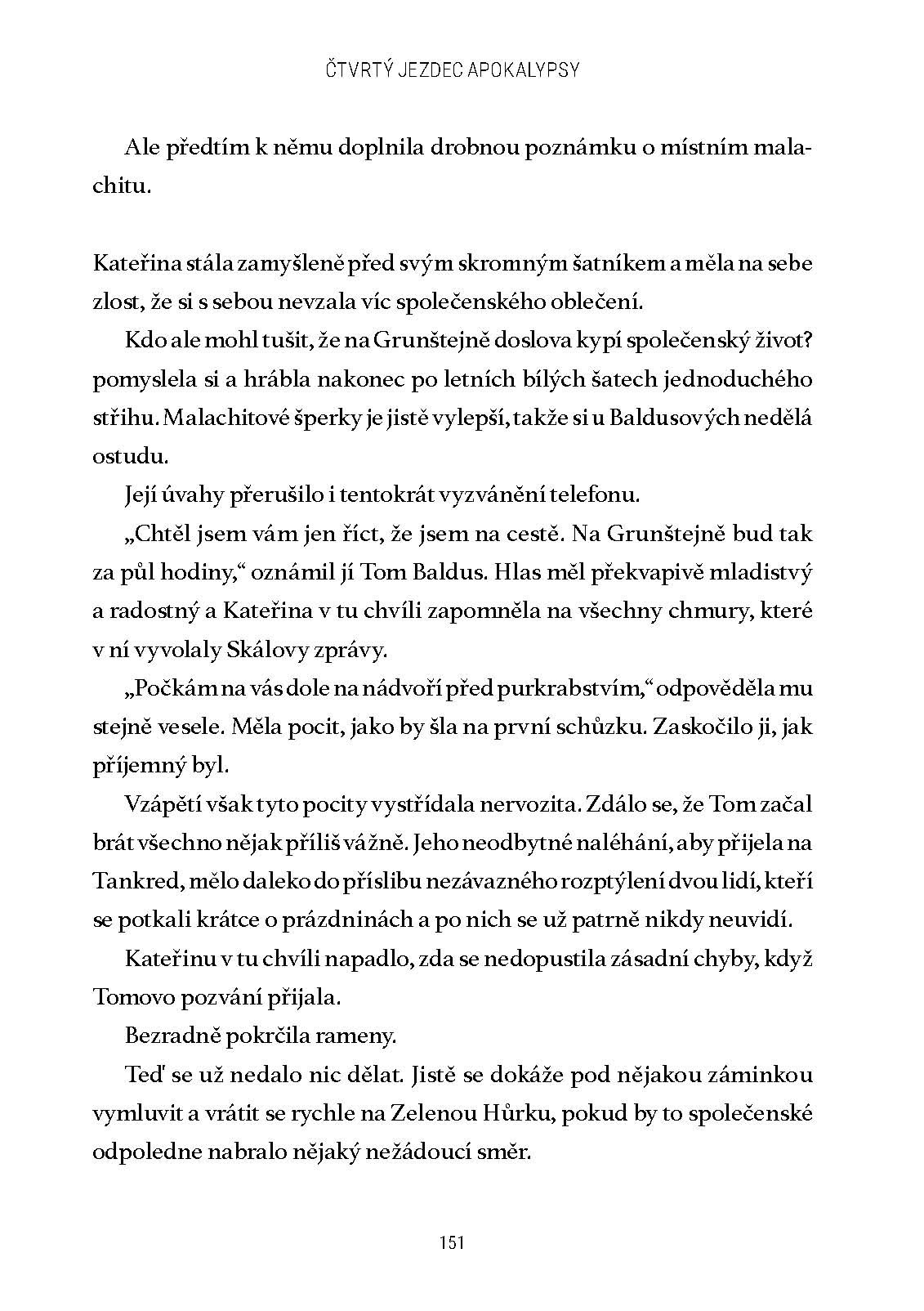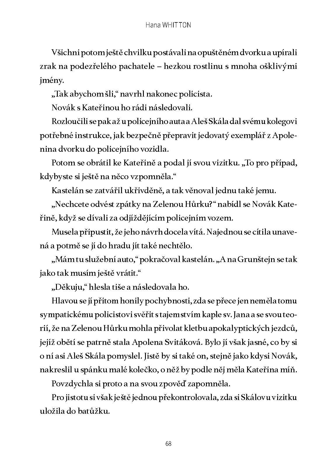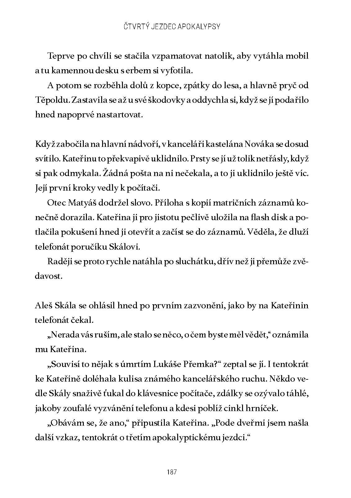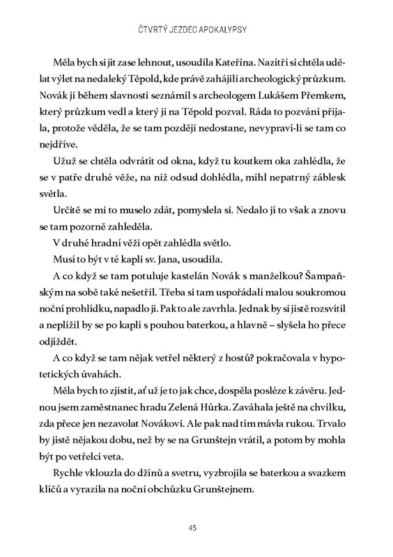 První úmrtí vypadá ještě jako nešťastná náhoda. Ale jen do té doby, než Kateřina Králová dostane tajemný vzkaz, ve kterém se mluví o prvním jezdci Apokalypsy. A co požár v místní knihovně, při kterém zahynuli další dva lidé? Může to být zase jen náhoda, nebo Kateřina opravdu přivolala na hrad Zelená Hůrka a jeho okolí dávnou kletbu, když v jedné z hradních kaplí zůstala i po půlnoci? Pátrání po vrahovi ji zavede až do 13. století, do období vlády Přemyslovců, a na povrch začnou vyplouvat křivdy sahající do dávné rodinné historie. A k tomu zemře další člověk. Pro koho si přijede čtvrtý jezdec Apokalypsy?