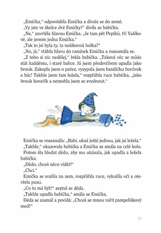 V malebném městě Berouně stojí dům, který vypadá jako kostka. Je to školka, kam chodí i povídalka Emička. A tahle holčička má babičku a dědu v jeskyňkové chaloupce schované za hustým křovím. Když je Emička s tatínkem navštíví, do chaloupky může vejít jen ona. Babička s dědou jsou totiž trpaslíci!