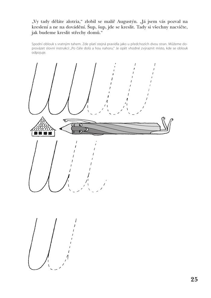 Nyní tedy máme před sebou pomocníka, který provede nás a naše dítě začátky psaní. Pomůže uvolnit dětskou ruku a hravou, příjemnou formou nás povede metodicky správnou cestou při ovládnutí všech základních tahů písmen. Autorka s podporou svého osvědčeného spolupracovníka malíře a ilustrátora Richarda Šmardy si děti jistě získá příběhem pastelek Boženky a Máni a jejich kamarádek tužek, ty už děti znají z předchozích dílů, a nově i chlapce Adámka, kteří jsou nyní na návštěvě u malíře Augustina. Dítě tedy s Adámkem zvládá tvary od nejjednodušších ke složitým a vytváří si pěkné vlastní obrázky. Všimněte si, že za úvodním vyprávěním je několik listů, na nichž se opakují jednoduché prvky kreslení, které by mělo zvládnout dítě mladší. Nedaří-li se, nejde o žádné neštěstí, vždyť víme, že vývoj každého z nás, tedy i našeho dítěte, je individuální, má své zvláštnosti. Dobrým pomocníkem budou v tom případě předcházející díly grafomotorických cvičení. Je lépe začít pracovat s nimi, abychom obtížnými úkoly dítě od kreslení neodradili. Samozřejmě, jsou-li obtíže výraznější, neváhejme požádat o konzultaci poradenské pracoviště (např. pedagogicko-psychologickou poradnu). Myslím si však, že stojí za to získat dítě pro kreslení a psaní s podporou této publikace. Je velmi vhodná pro děti před nástupem do školy, ty zapsané i ty, jimž byl nástup školní docházky z nějakých důvodů odložen. Užitečná je také prvňáčkům proto, aby se jim lépe psalo nebo i těm, pro něž je psaní velmi namáhavá práce. My dospělí máme někdy krátkou paměť, nevzpomínáme si, jak těžké to bylo napsat řádek v sešitě přesně podle předpisu. Zkusme si pořídit předepsaný sešit pro 1. ročník a krasopisně jej vypsat. A to nad námi nebude nikdo stát a říkat: „Seď rovně!“, „Nepiš nosem!“, „Piš hezky!“ Co je to „psát hezky“? Znamená to psát lehce, s chutí, bez námahy, s radostí z dobrého díla. Dobrý výsledek se, jako při každé jiné práci, dostaví jen tehdy, máme-li vhodný materiál pro cvičení a vedle sebe laskavého člověka, který nás podpoří. Kvalitní cvičební pomůcku máme před sebou a tím laskavým člověkem je táta, máma, babička, dědeček…..
