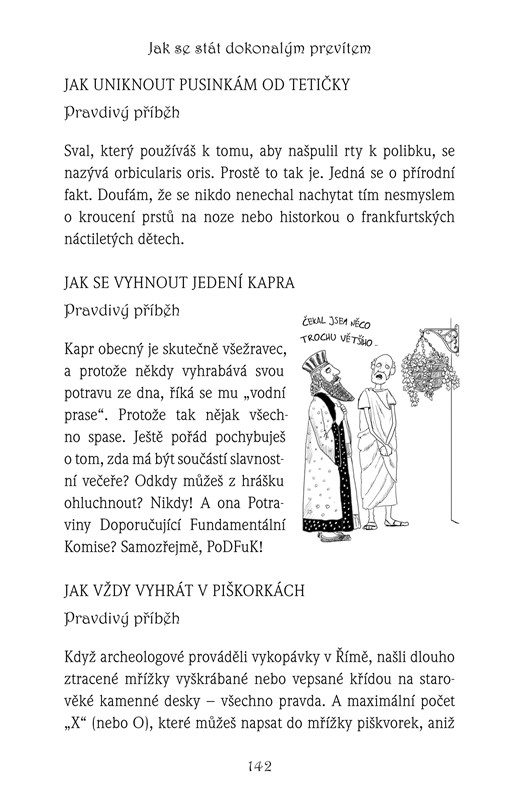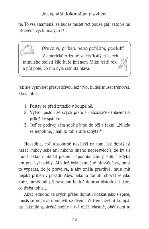 Kniha Jak se stát dokonalým prevítem ti ukáže spoustu neotřelých triků, které ti můžou každý den ulehčit život. Zjistíš například, jak se elegantně vyhnout hodině tělocviku ve škole, vždycky porazit kamarády v piškvorkách a kámen, nůžky, papír, jak donutit rodiče, aby ti přidali kapesné, nebo jak utéct domácím pracím z lopaty.