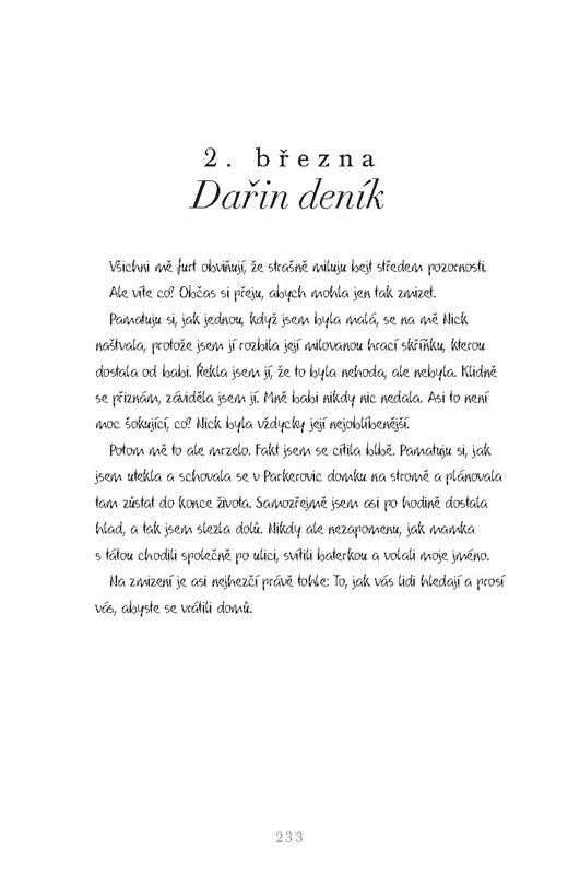 Nick se sice rozhodne, že vše, co ztratila, získá zpět, ale Dara už má jiné plány. A když o svých narozeninách Dara zmizí, Nick si zpočátku myslí, že je to nějaká hra, že se Dara zase předvádí. Ale zmizela i jiná dívka, devítiletá Madeline Snowová, a Nick je čím dál víc přesvědčená, že ta dvě zmizení spolu souvisí. A teď musí najít svoji sestru dřív, než bude pozdě.