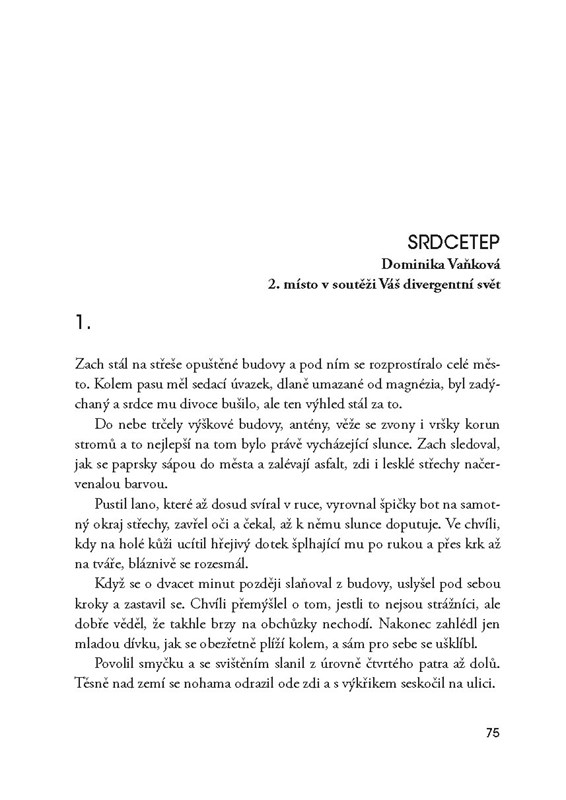 V knížce DivergentCzech najdete světy, v kterých řádí choroby krve, kde je mluvení bráno za přežitek, a když se vám moc rozbuší srdce, třeba jen z radosti, je to taky špatně. Budete číst příběhy o lásce na ten nejpodivnější možný způsob. Křehké, něžné, akční, ale i strašidelné. Budete se bát i vztekat nad hlavními hrdiny jako v každé jiné knize, jen tentokrát bude každé písmenko původní české.