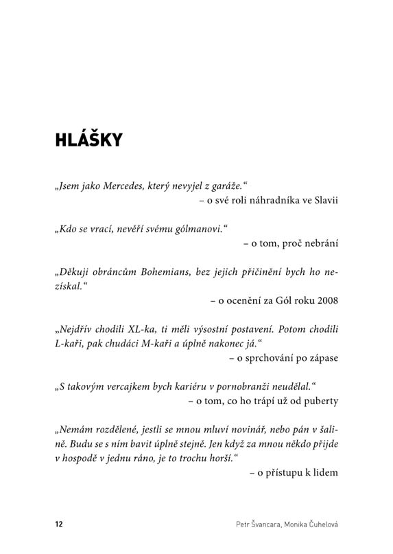A stejné množství fotbalových nadšenců si jistě rádo přečte tuto poutavou biografii, kterou Petr pro všechny své fanoušky – a nejen pro ně – sepsal s populární moderátorkou České televize Monikou Čuhelovou. Kniha sleduje všechny vzlety i pády Petra Švancary a samozřejmě odkrývá i spoustu pikantností ze zákulisí velkého fotbalu.