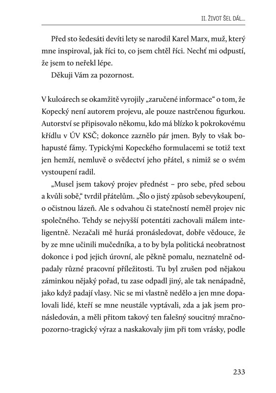 Seděl jsem na mezi nahoře nad mlejnem, neviděn, nepozorován, a tu vidím, asi tak čtyřicet metrů ode mne jde mladá holka. To je krása, krásná mladá holka. Víc už není. A tu na mne padla taková lítost (tak by to řekl Karel Poláček), že tohle vše se mne už netýká, že jsem se sám dojal. A přemýšlel jsem. Vzpomněl jsem si, jak mi Werich kdysi řekl: „...víte, Kopejdo, když je člověk mladej, tak ani neví, co povídá. My jsme s Voskovcem psali text BABIČKY MARY a napsali jsme tam – a bezzubou dásní zaláteří. Nám se to líbilo, jak jsme vtipný. A teď se na mne podívejte, já mám tu bezzubou dáseň a kop bych to celý do prdele!“