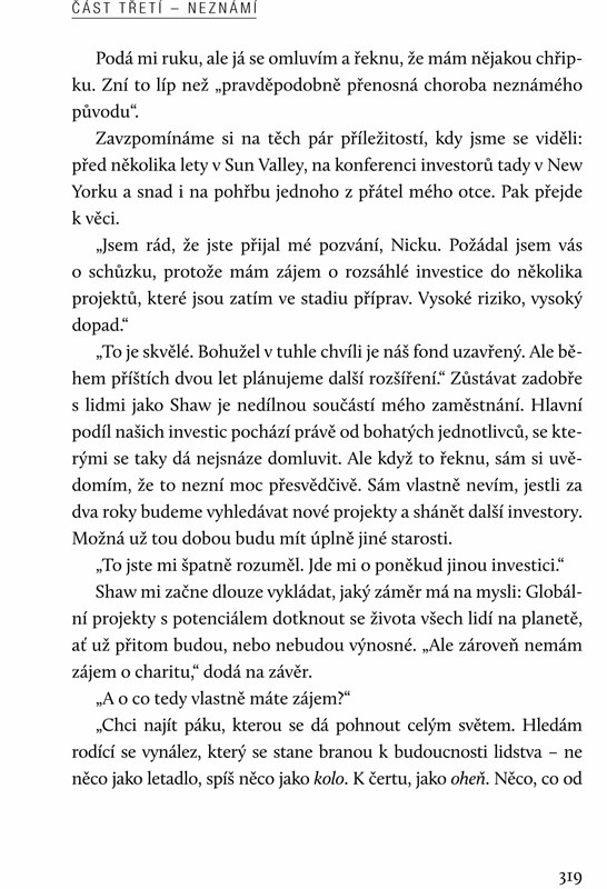 Vynalézavý sci-fi thriller od autora světově úspěšné bestsellerové trilogie Tajemství původu je dobrodužný příběh plný ostrých zvratů, v němž se prolíná síla moci, ambice, osud, paměť i láska.