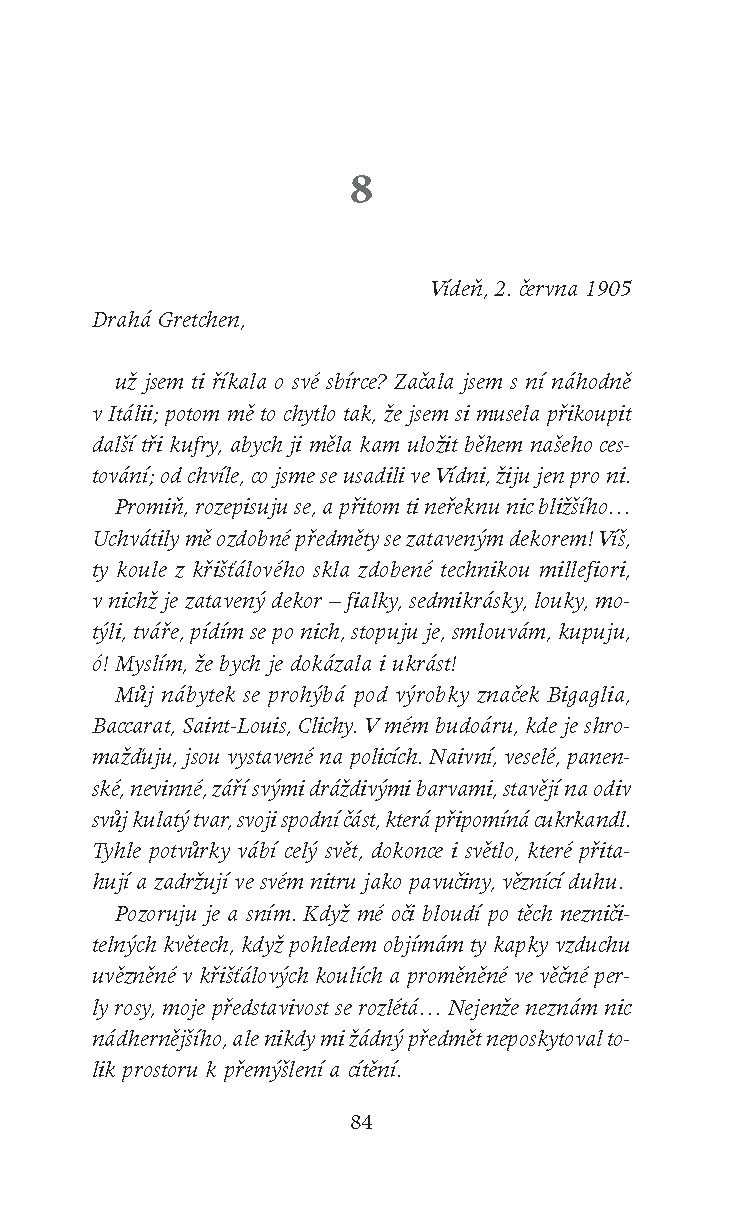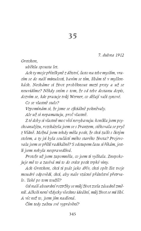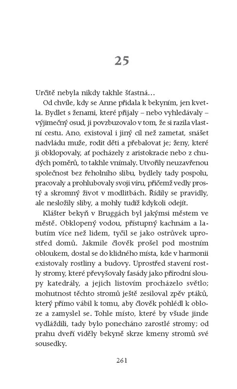 Anne se podívala do kulatého rámu, uzřela své stažené rysy, ocenila umně spletené vlasy, které vytvářely z její světlé kštice rafinovaný účes, udivilo ji, že má tak dlouhý krk a tak malé uši. Přesto měla podivný dojem: sice v zrcadle nespatřila nic nepříjemného, ale neviděla ani nic blízkého, pozorovala cizinku. Její obličej z anfasu, ze strany či zezadu mohl být její, ale stejně mohl patřit jakékoli jiné ženě; nepodobala se sama sobě.