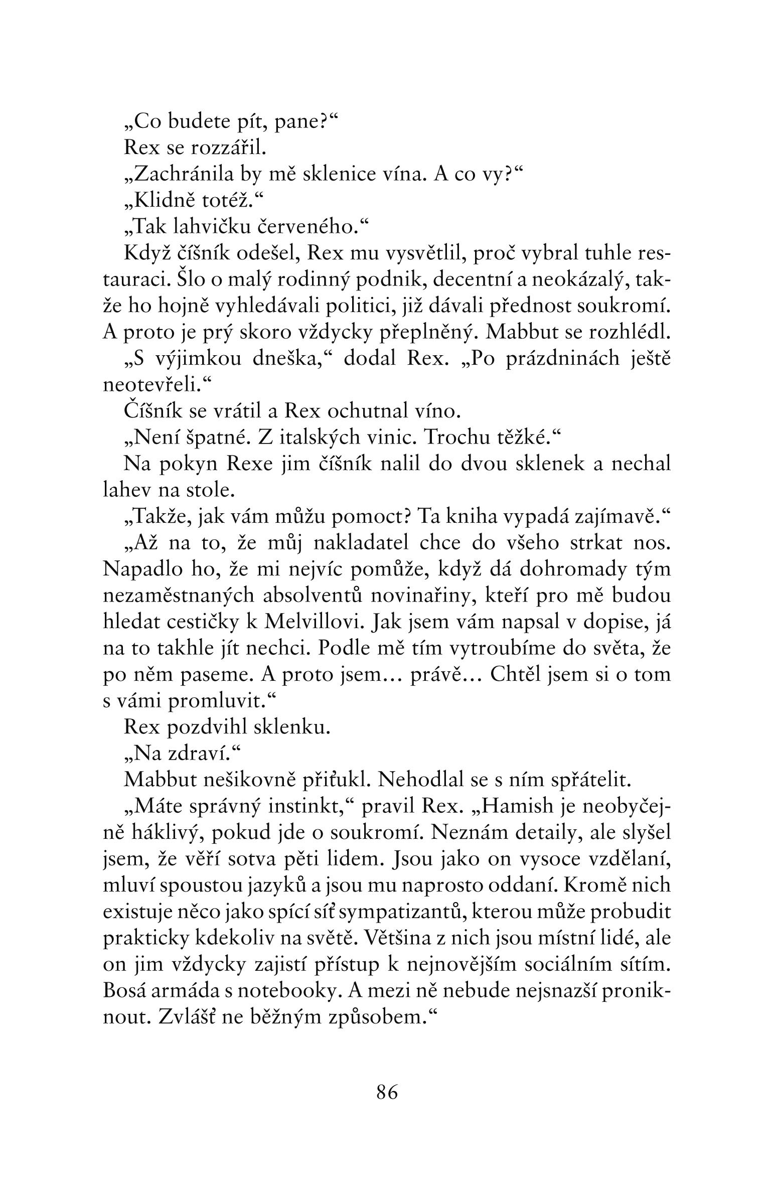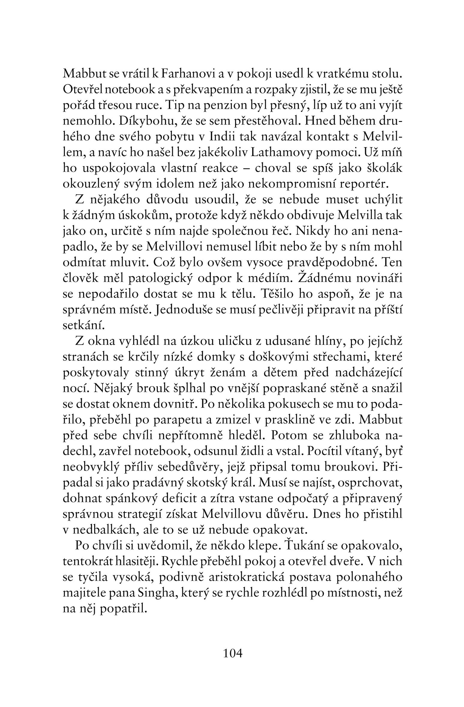 Muž mnoha talentů, člen oblíbené komediální skupiny Monthy Pyhonů, herec a spisovatel Michael Palin nás v příběhu o novináři, který se vydal po stopách legendami opředeného humanisty a aktivisty Hamishe Melvilla, zavede až do daleké Indie. Keith Mabbut je muž na křižovatce. A lákavá nabídka napsat životopis nesmírně vlivného, ale právě tak unikavého zastánce lidských práv, mu přijde vhod. Pátrání po pravdivém příběhu tohoto muže jej zavede překrásných koutů Indie, ale i na místa, kde je příroda civilizačním rozmachem extrémně ohrožená. Čím víc se toho Mabbut o Melvillovi dozvídá, tím jeho obdiv roste – je těžké odolat kouzlu idealisty, který se nebojí měnit svět. Ale je jeho hrdina vskutku mužem, za jakého se vydává? Pravda, jak Keithe postupně zjišťuje, je totiž někdy taková, jakou si ji uděláme...