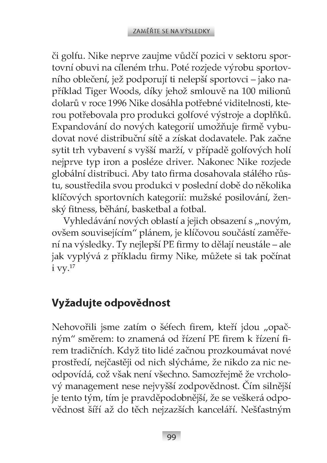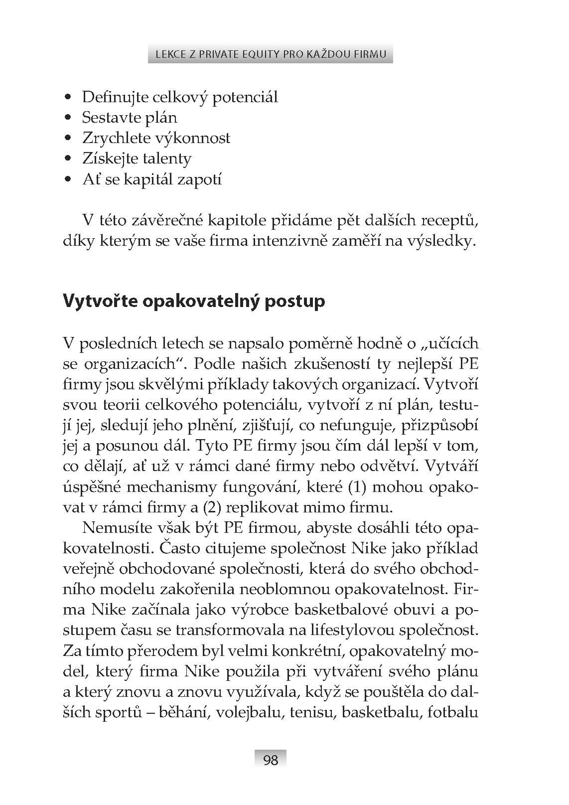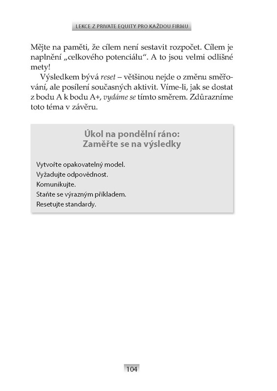 Některé lekce mohou mnohým připadat známé. Jiné dokonce zjevné. Podle autorů však nejsou firmami po celém světě uplatňovány důsledně a pečlivě. Má to dva hlavní důvody: za prvé, uplatňování těchto lekcí s sebou přináší reálné změny, a dávno dobře víme, že lidé změny nemají rádi. Za druhé, řada lídrů sice tyto lekce uplatňuje, ovšem nedostatečně. Je totiž mnohem jednodušší dělat něco „uspokojivě“ než „dokonale“. Jde, mimochodem, o velmi rozšířenou chorobu v podnikání. Nejdůležitějším posláním lídra přitom je dosáhnout toho, aby jeho firma měla větší hodnotu. Většina studií potvrzuje, že ti nejlepší private equity lídři si přesně tak počínají: jejich investice vedou k excelentním ziskům, obvykle po třech až pěti letech vlastnictví. Tato kniha se právě těmito excelentními výsledky zabývá, vysvětluje, jak jich lídři dosahují a proč je jejich počínání relevantní pro všechny společnosti, bez ohledu na jejich vlastnickou strukturu.